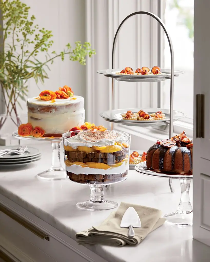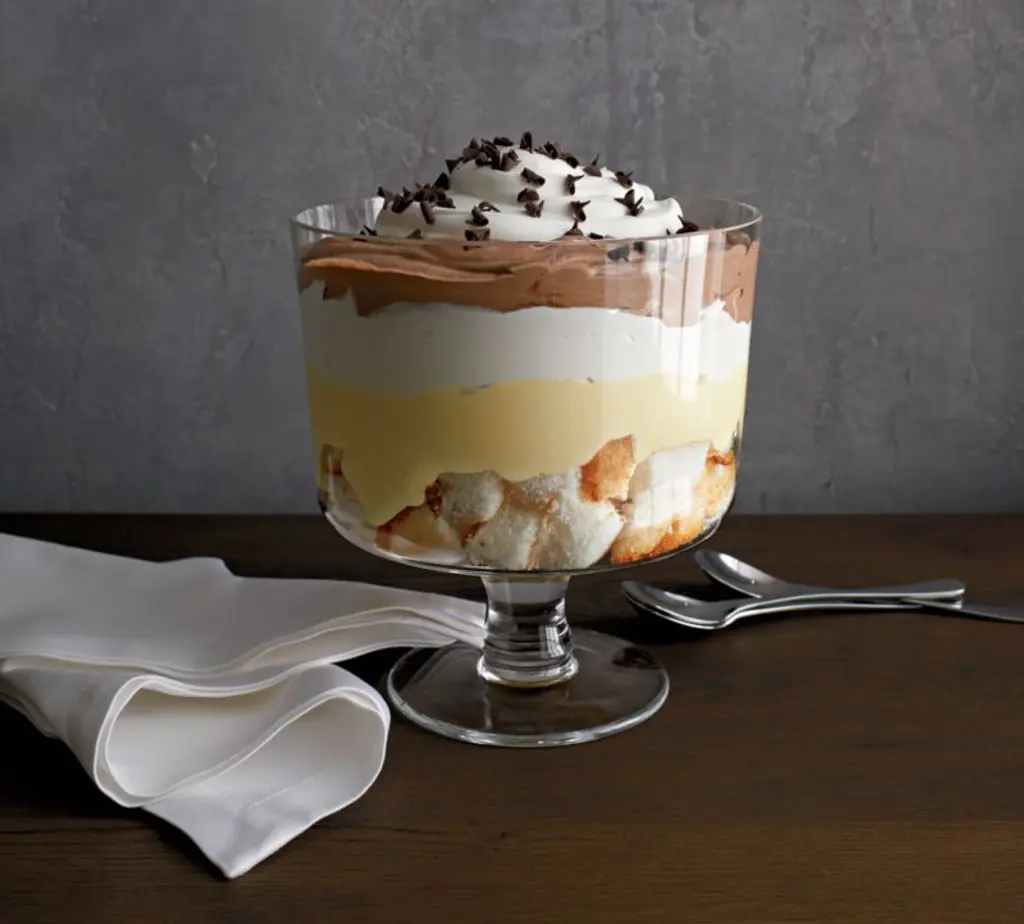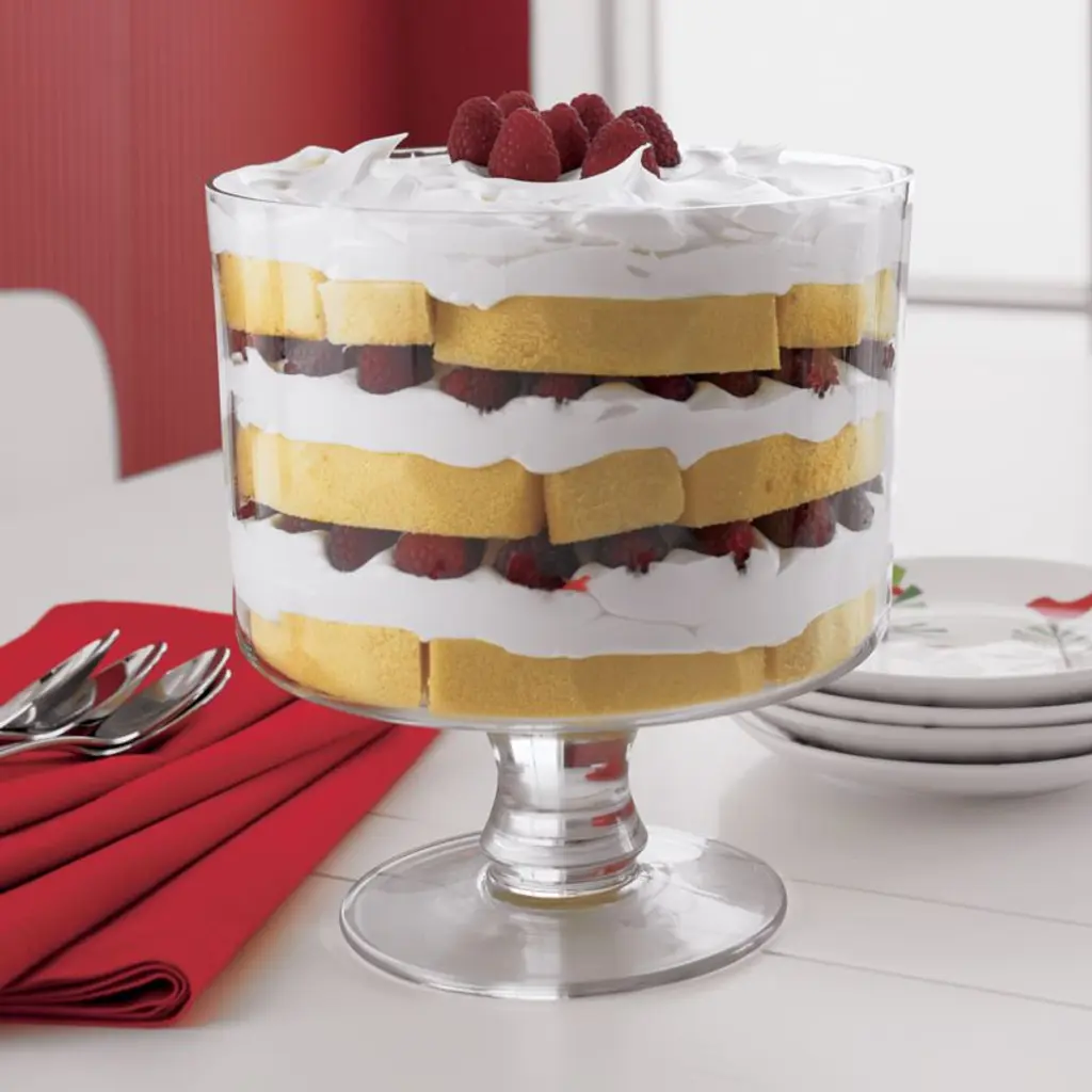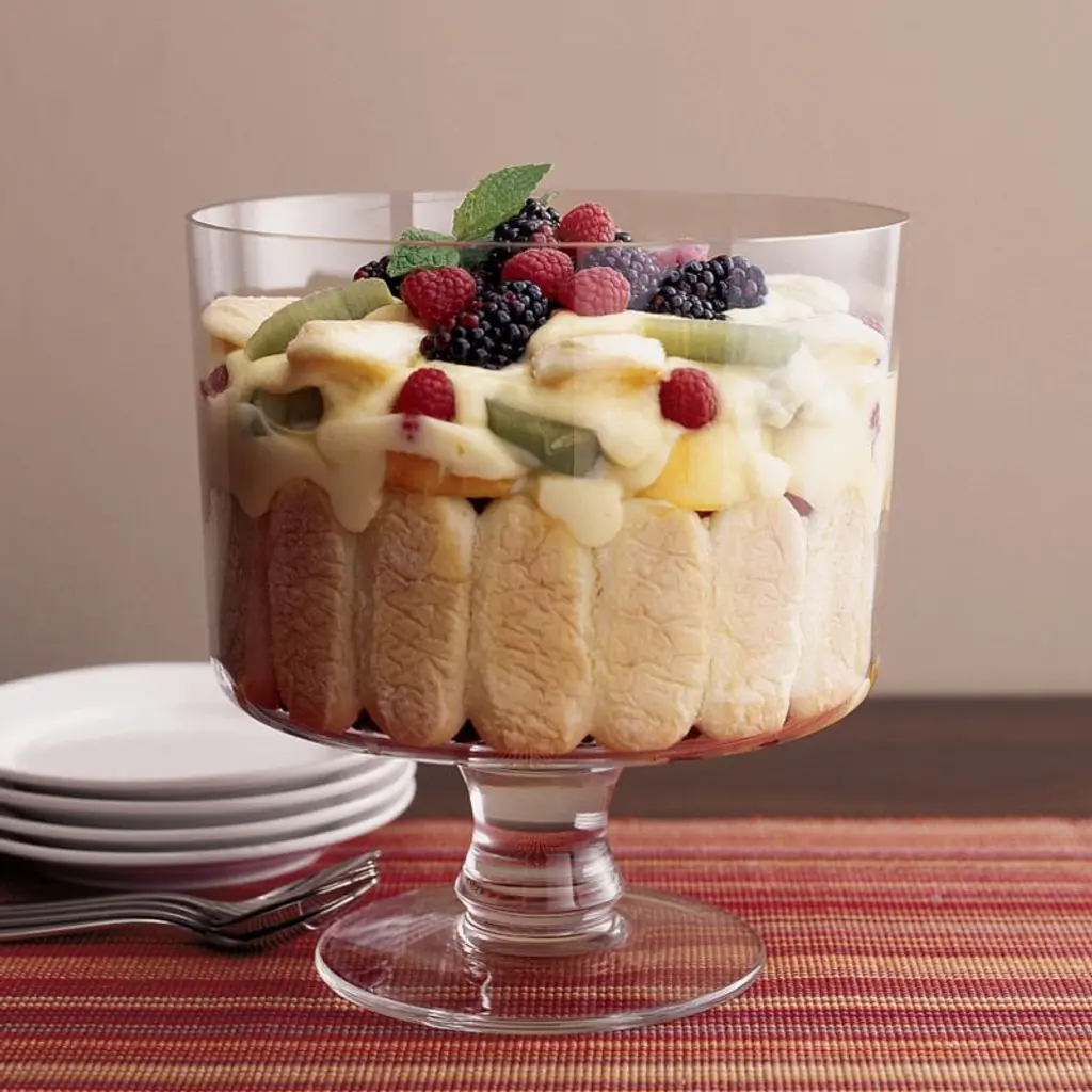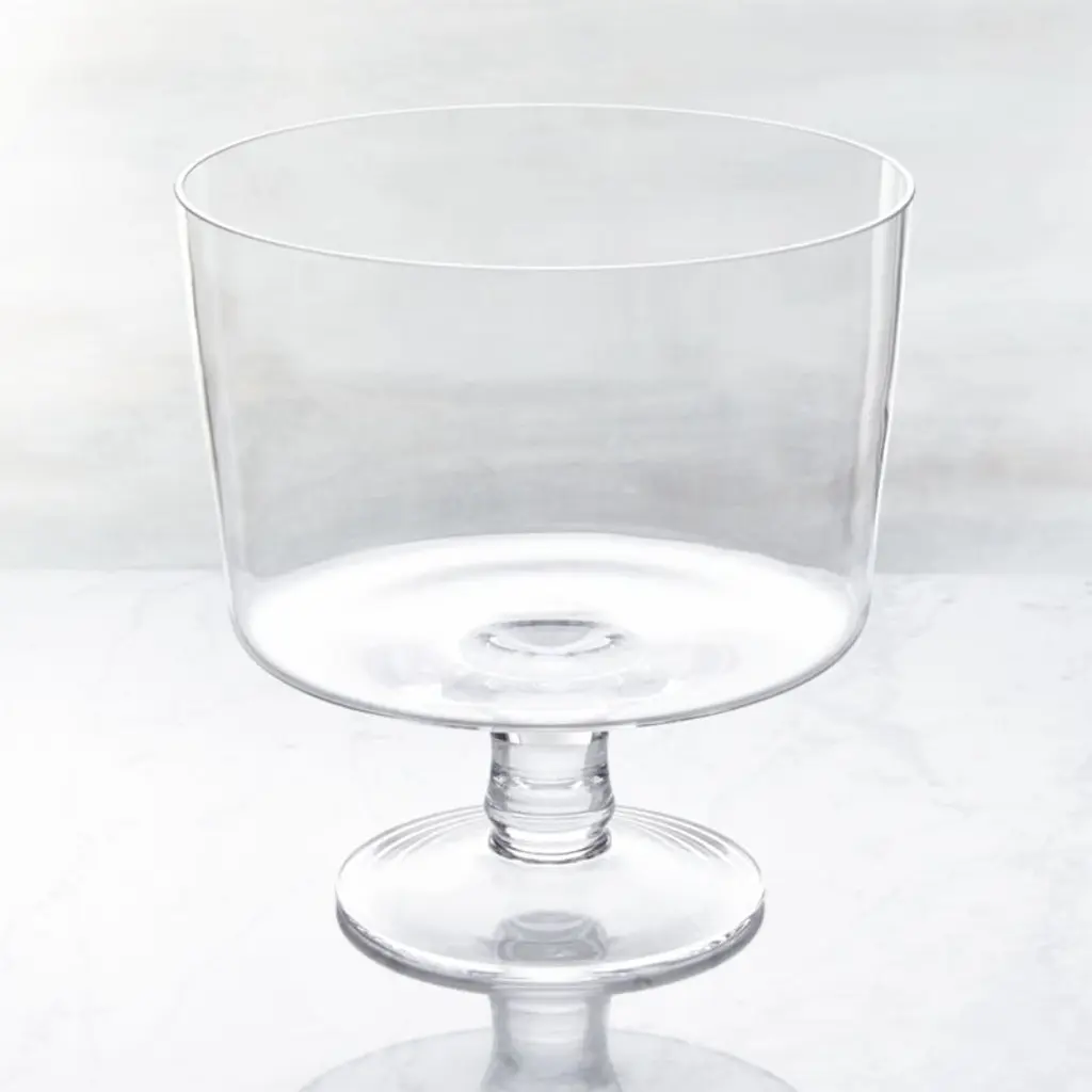 Elevated elegance. Crafted from very clear glass, this updated trifle bowl enhances the appearance of the delicacies within. Display and serving bowl features a classic straight-sided, footed design with a fancy, molded thick stem. The perfect setting for trifle, fruit and vegetable salads, and layered dishes.