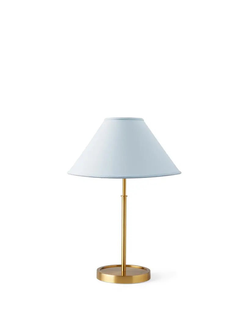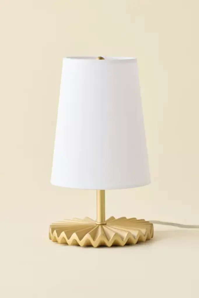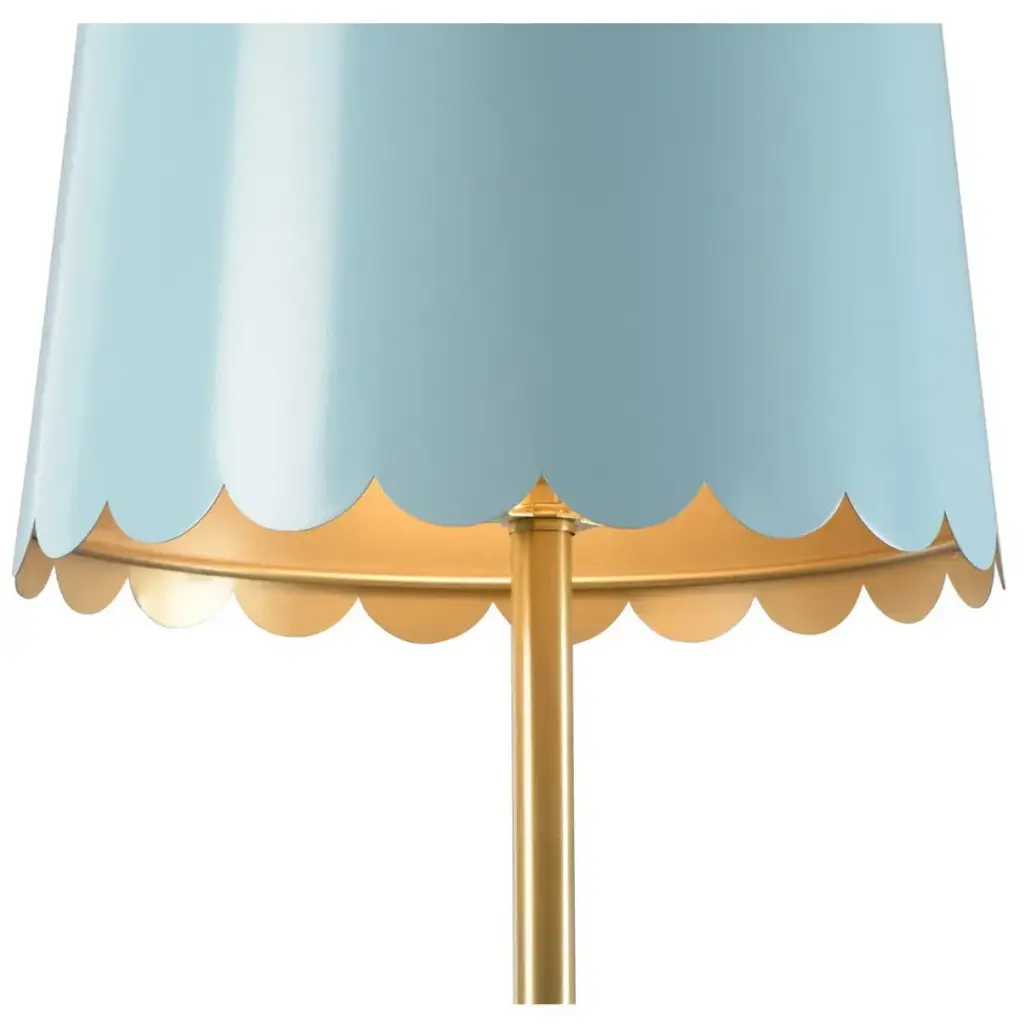 A SLEEK BRASS LAMP WITH A PLAYFUL SCALLOPED TOLE SHADE.