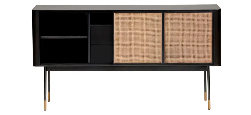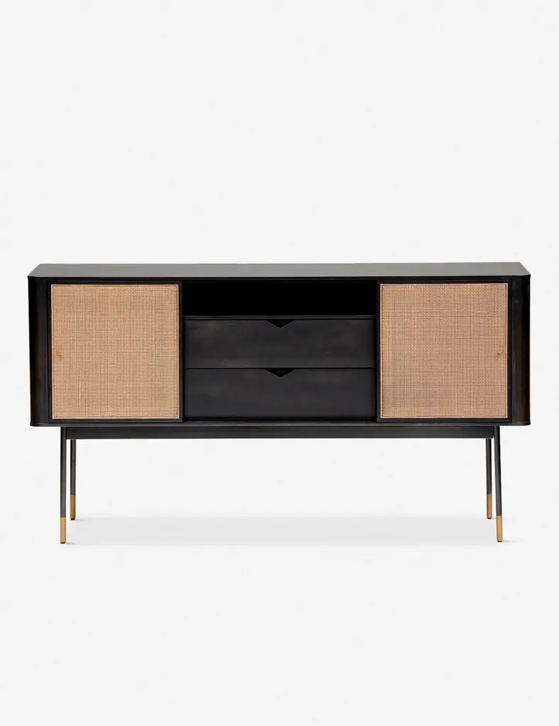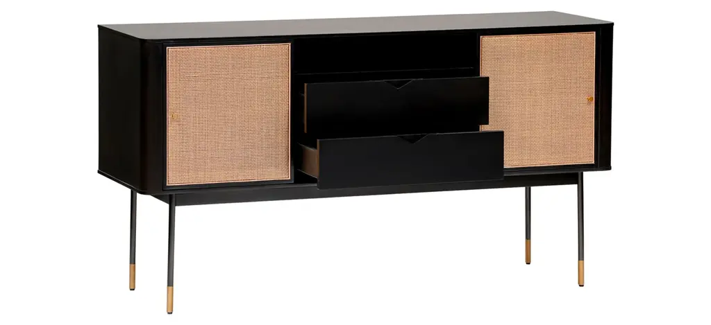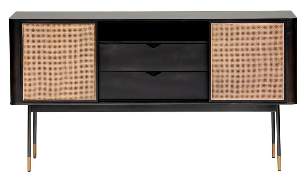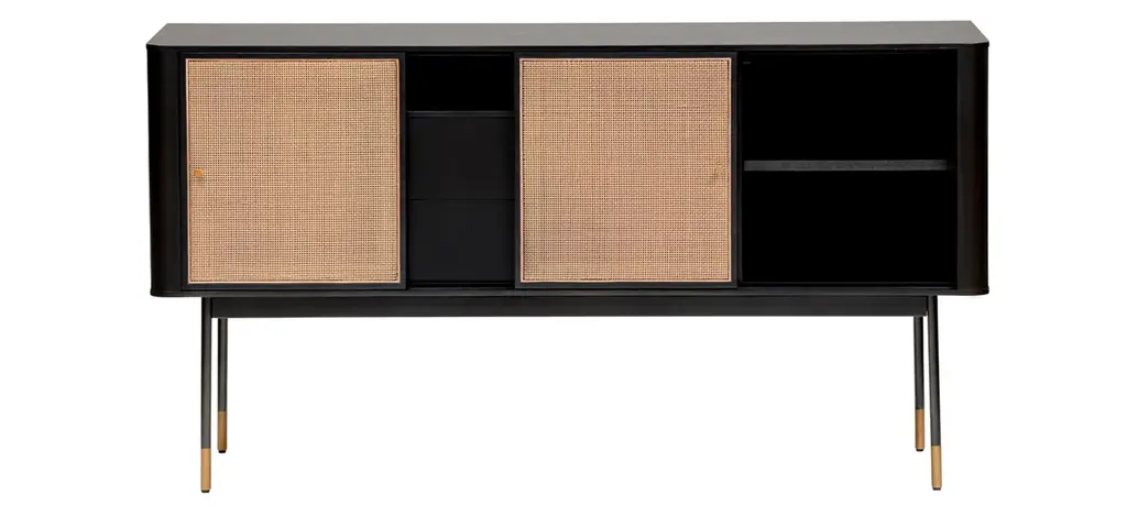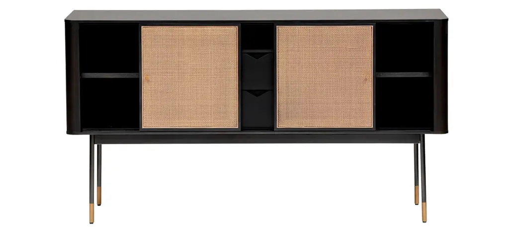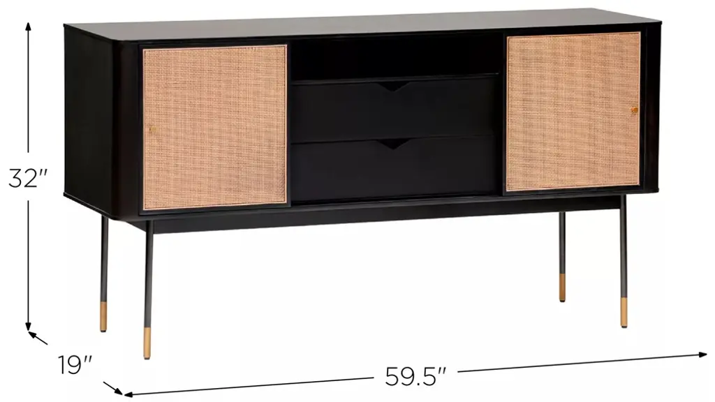 The Miriam Sideboard, with its contemporary lines, is as stunning as it is functional. This 59-inch sideboard features a solid wood outer frame and steel legs with bronze lower accents. There are two wicker sliding compartment doors with brass handles, that enclose ample space and shelves for convenient storage. The two center pull out drawers features smooth lower glides which gives the sideboard a clean and sleek look.
