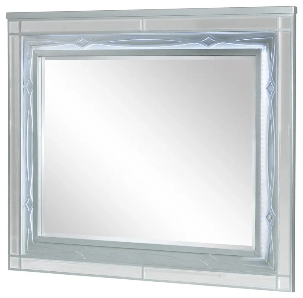 Mirror with LED and Mirrored Trim Accent, SilverRavishing and stylish, this mirror is here to steal the show. Encased in rectangular wooden frame, it has mounting hardware for easy hanging. The mirrored trim accent for a touch of beauty. The LED lighting adds a creative and functional touch to it.