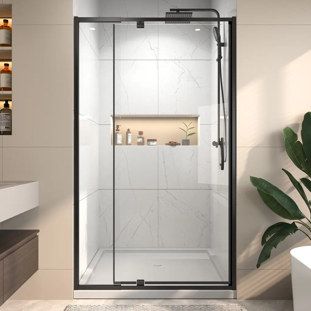 The Violeta Collection offers sleek, frameless heavy glass shower doors in a variety of configurations to suit the needs of your bathroom arrangement. You've spent so much time creating the perfect look and feel - Enhance the look of your master bathroom or guest bath with this modern and stylish shower door from the Violeta Collection. . Easy to clean, 3/8” heavy clear glass with H2OFF® Clean Glass Technology applied to the inside surface of the glass keeps your shower door looking like new. This hinged shower door also comes with two mitered back-to-back handles and hinges available in 3 modern finishes. Take your new shower doors a step further, gorgeous finishes, elegantly shaped handles, and stylized glass are all available.Miseno MSD4874-CLH Features:Miseno MSD4874-CLH Specifications: