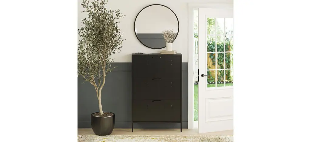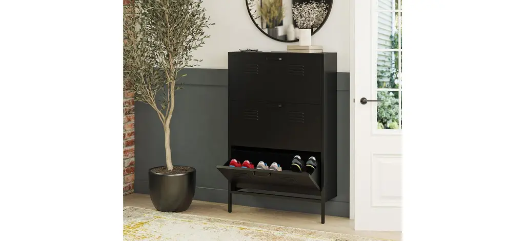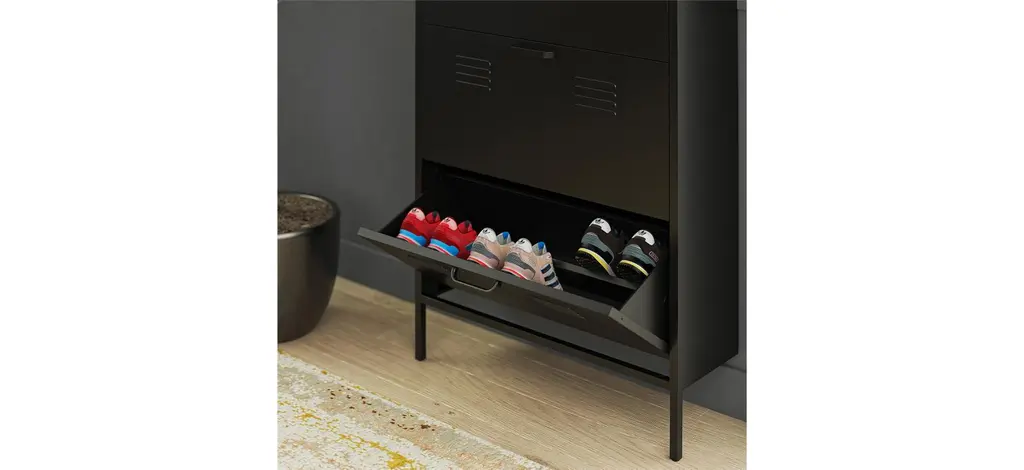 Bring a bit of nostalgia and a bunch of organization to your home with the Mission District Locker Shoe Cabinet. Available in several neutral colors, the Mission District is designed with all your shoe storage needs in mind. Three sturdy metal drawers fold out to keep your shoes right where you need them without cluttering up your entryway. The durable metal construction not only looks great but can easily be wiped with a damp cloth for easy cleaning. The 3 Door design accommodates up to 18 pairs of average-sized tennis shoes, with enough space for a US women’s size 14 shoe. The Shoe Storage Cabinet must be anchored to a wall. A wall anchor kit and instructions are included. The Cabinet ships flat to your door and requires assembly upon opening.