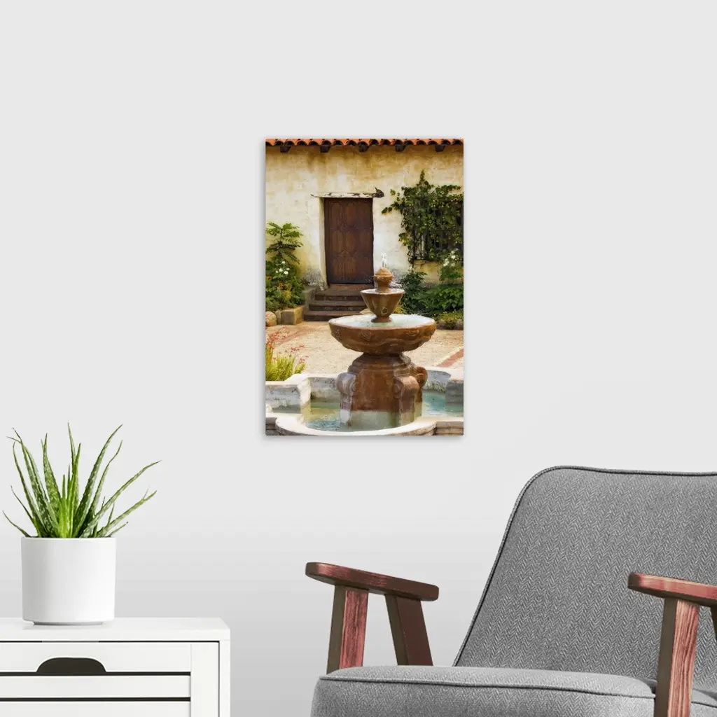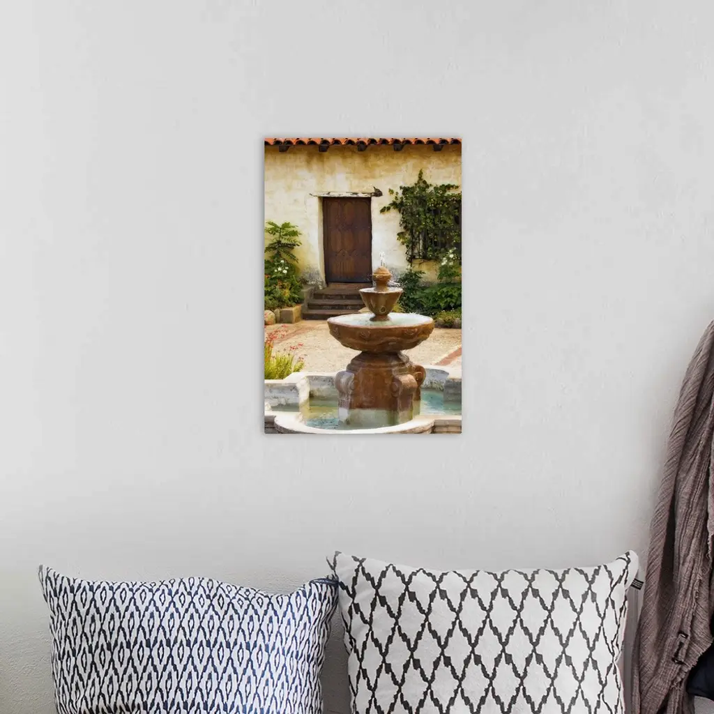 Photograph taken of a fountain sitting in front of a home with steps leading up to a wooden door. Foliage sits to either side of the door.