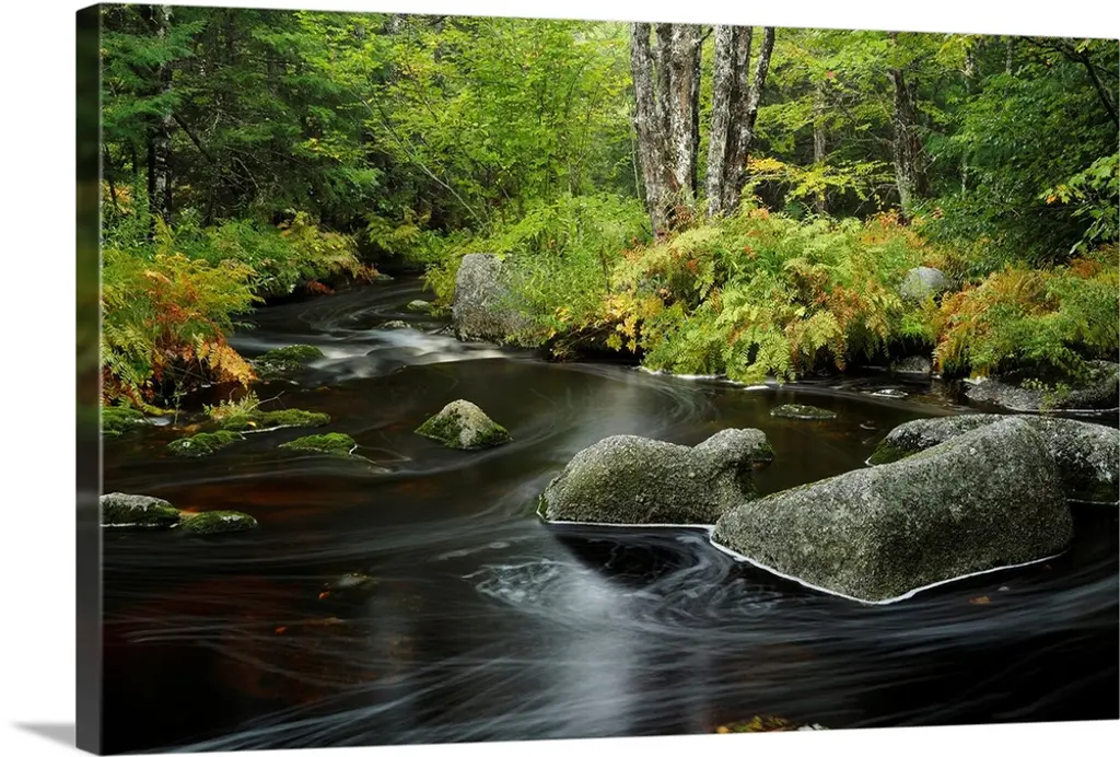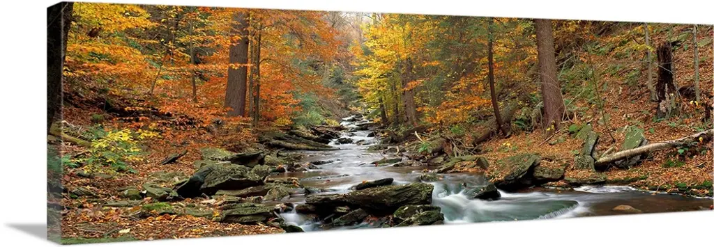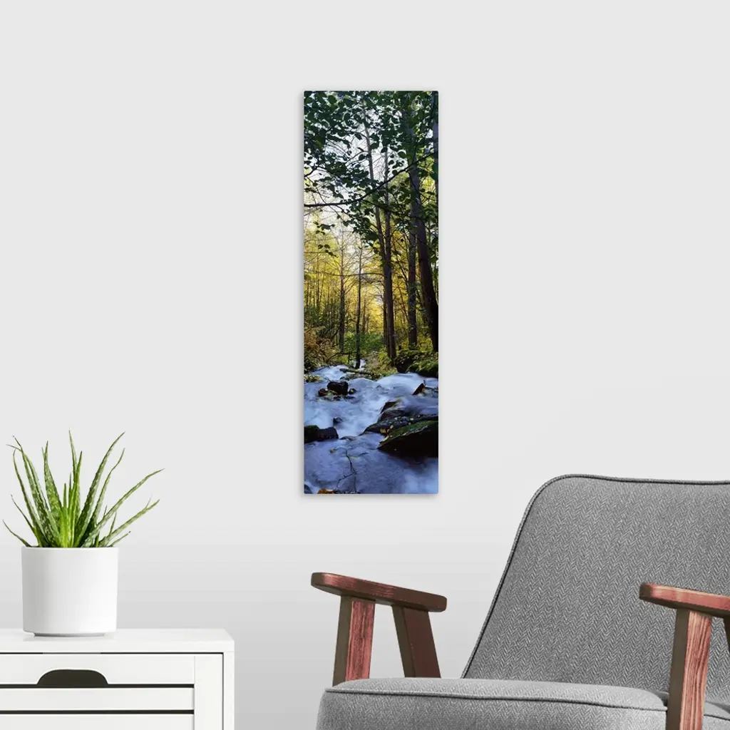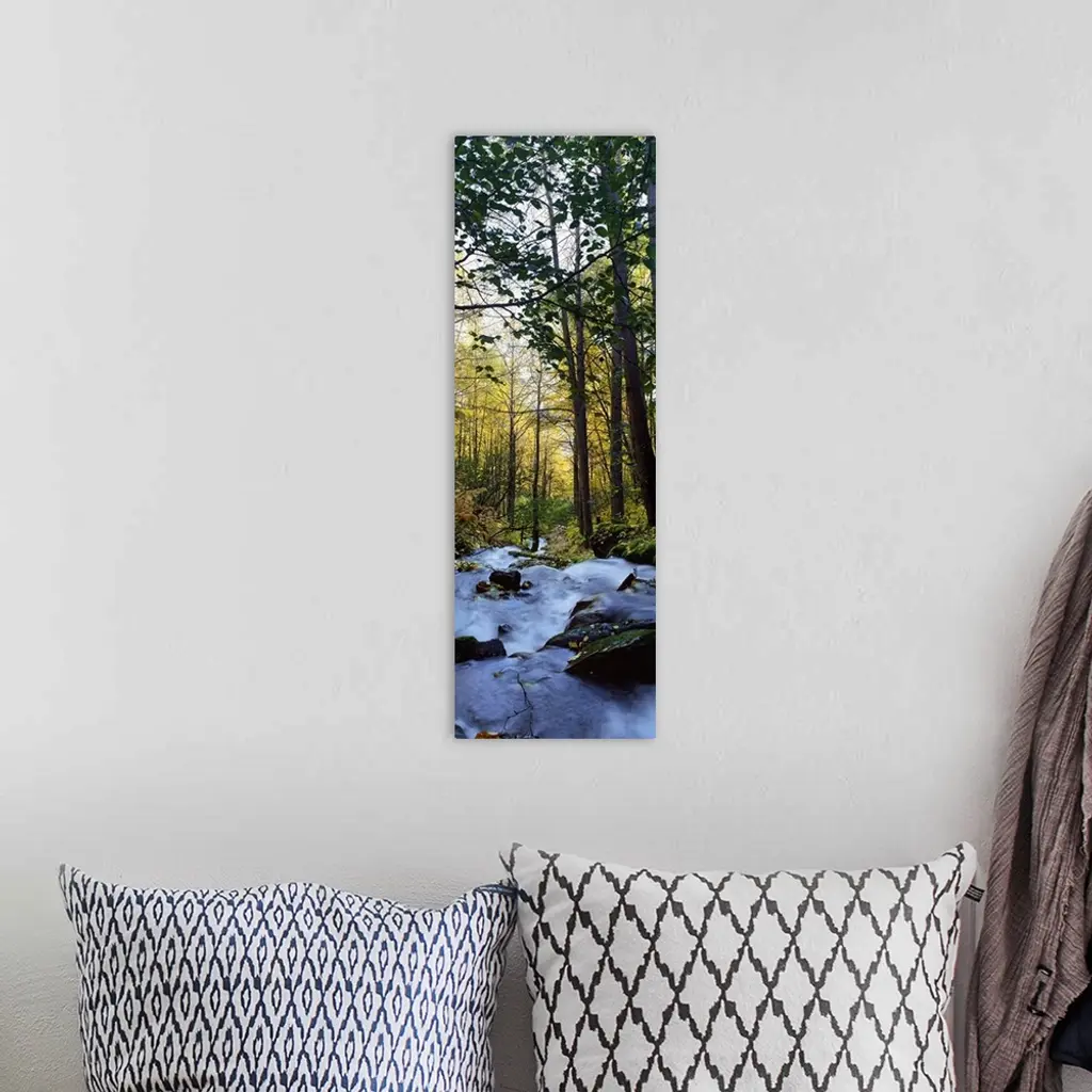 A rushing stream cuts through dense forest in this tall panoramic piece.