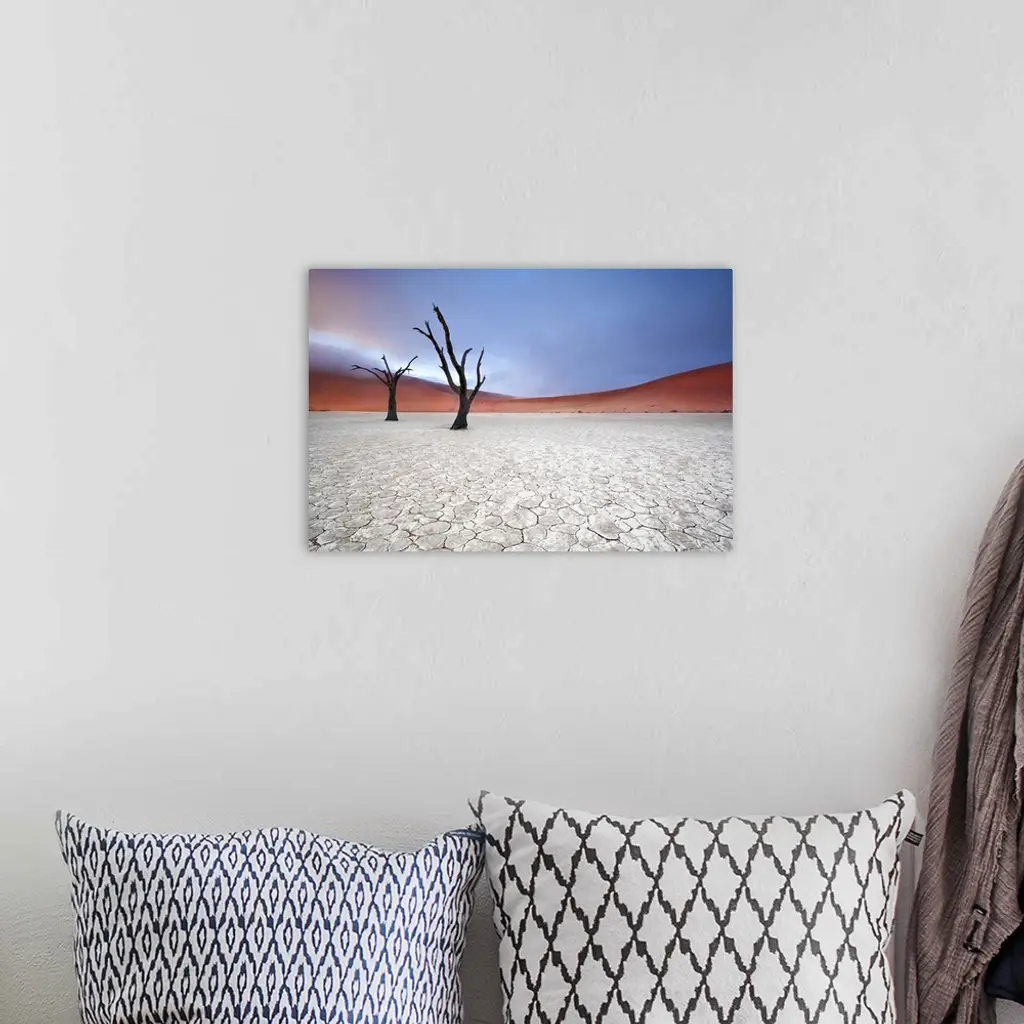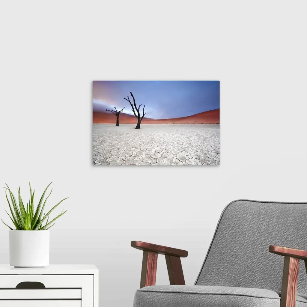 Two barren trees in the desert landscape on a foggy morning, Sossusvlei, Namibia.