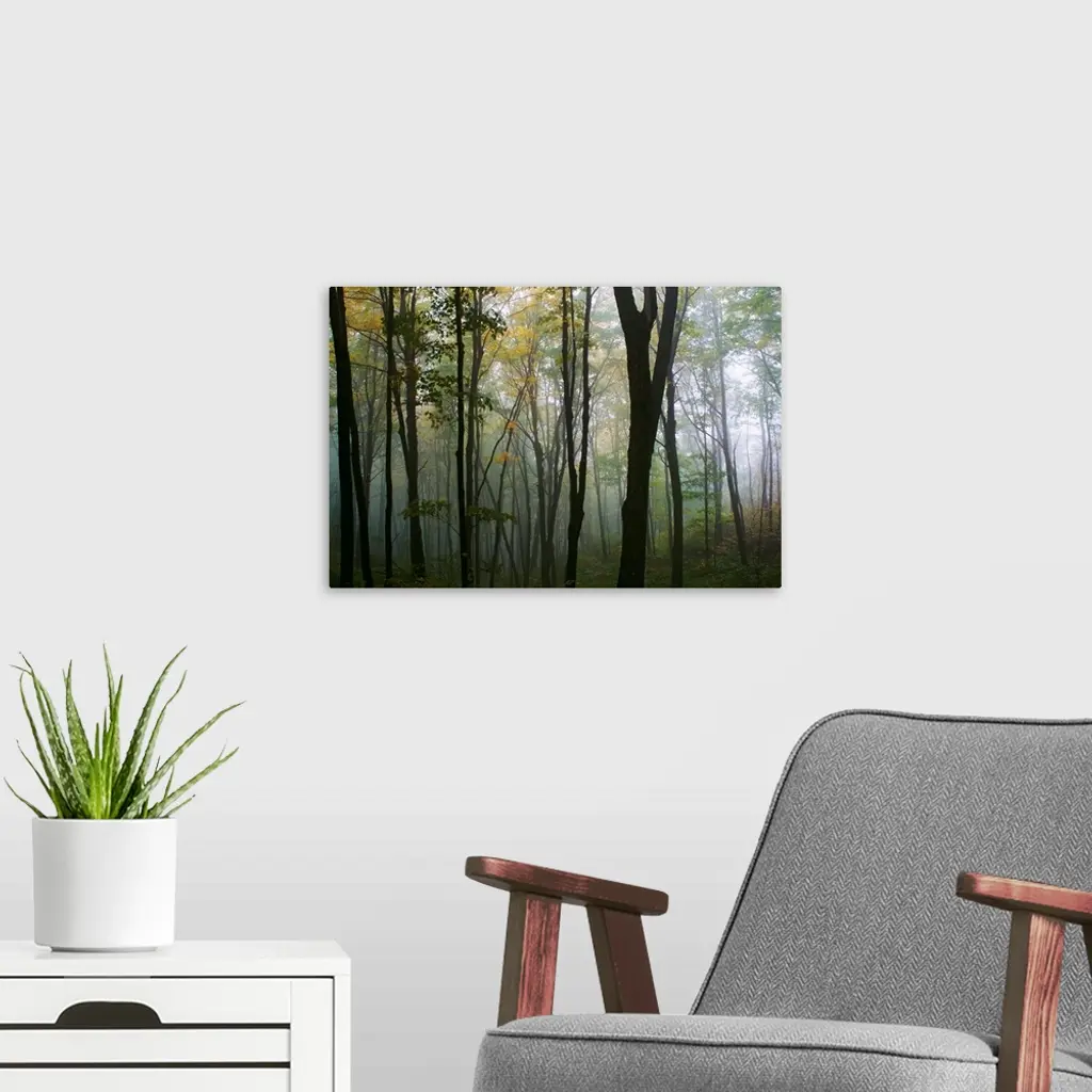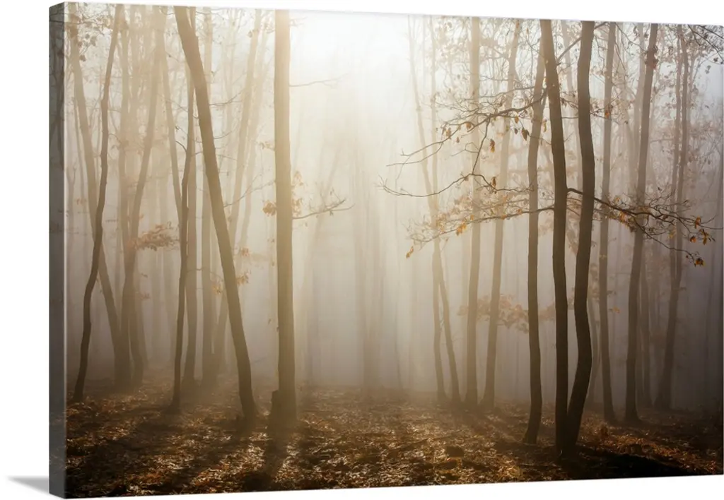 Decorative wall art for the home or office this is a landscape photograph of a forest filled with a fog.