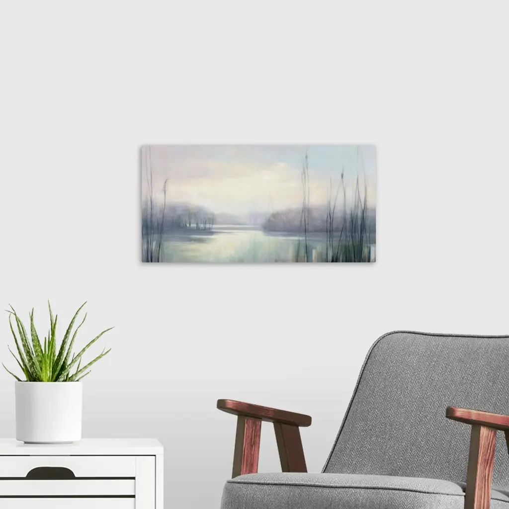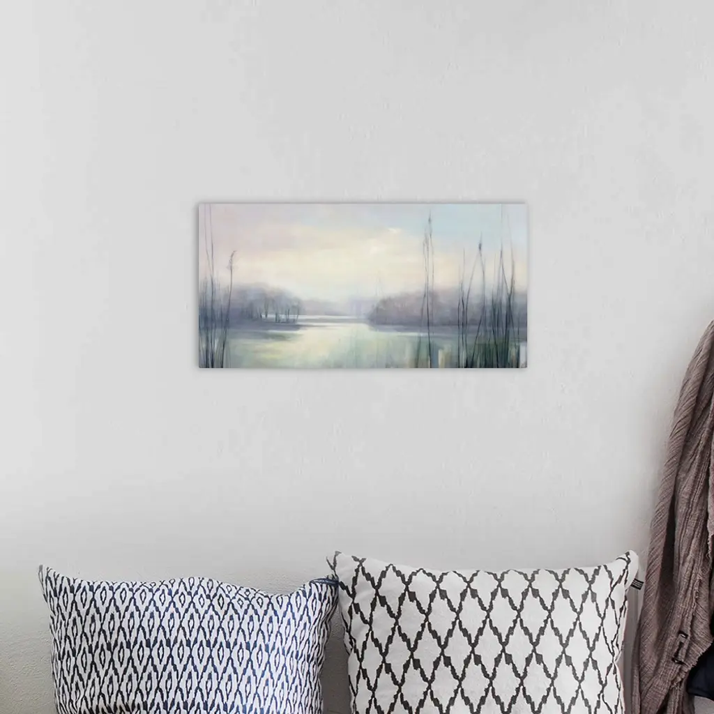 Large horizontal contemporary landscape of a lake covered in mist in muted tones of blue and gray.
