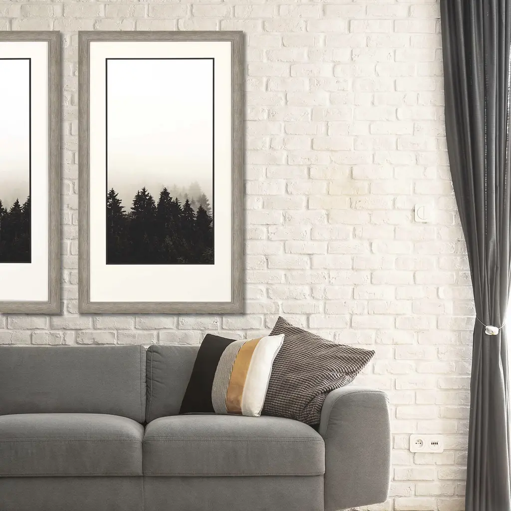 Shadowy peaks and tree-tops rise from the fog. Featuring offset white matting and a distressed silver finish moulding.