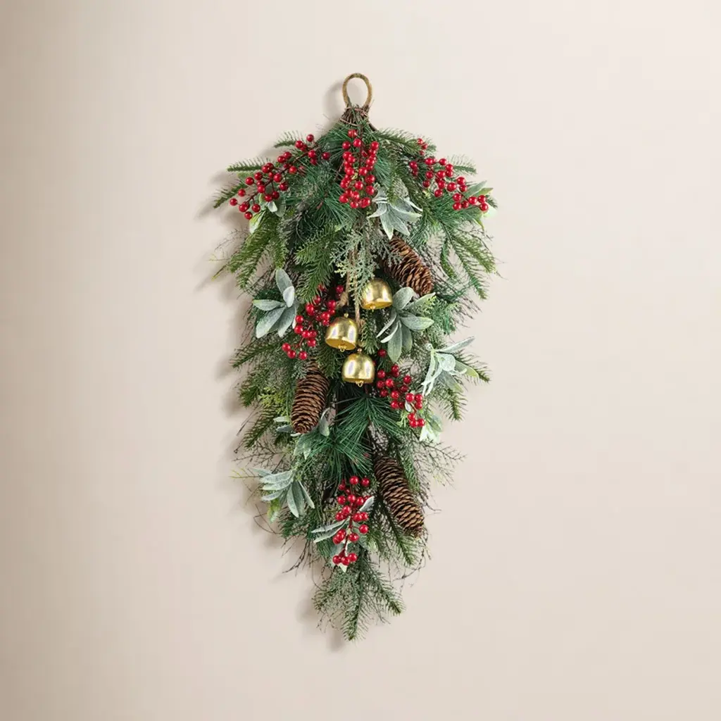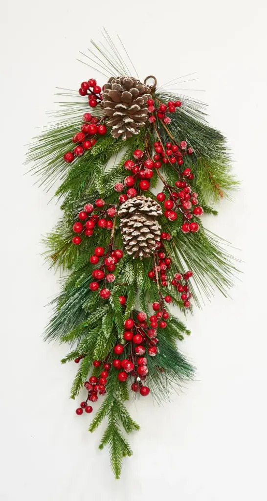 Create a warm and inviting holiday display with the Mixed Pine Juniper and Pinecone Wall Swag. Standing at 32 inches tall, this lush, nature-inspired arrangement features rustic pine foliage, natural pinecones, juniper branches, and berry accents in earthy green and brown tones. Perfect for front doors, walls, mantels, or stairway banisters, this swag brings a touch of the outdoors inside. Its versatile design allows for effortless styling in any festive setting.