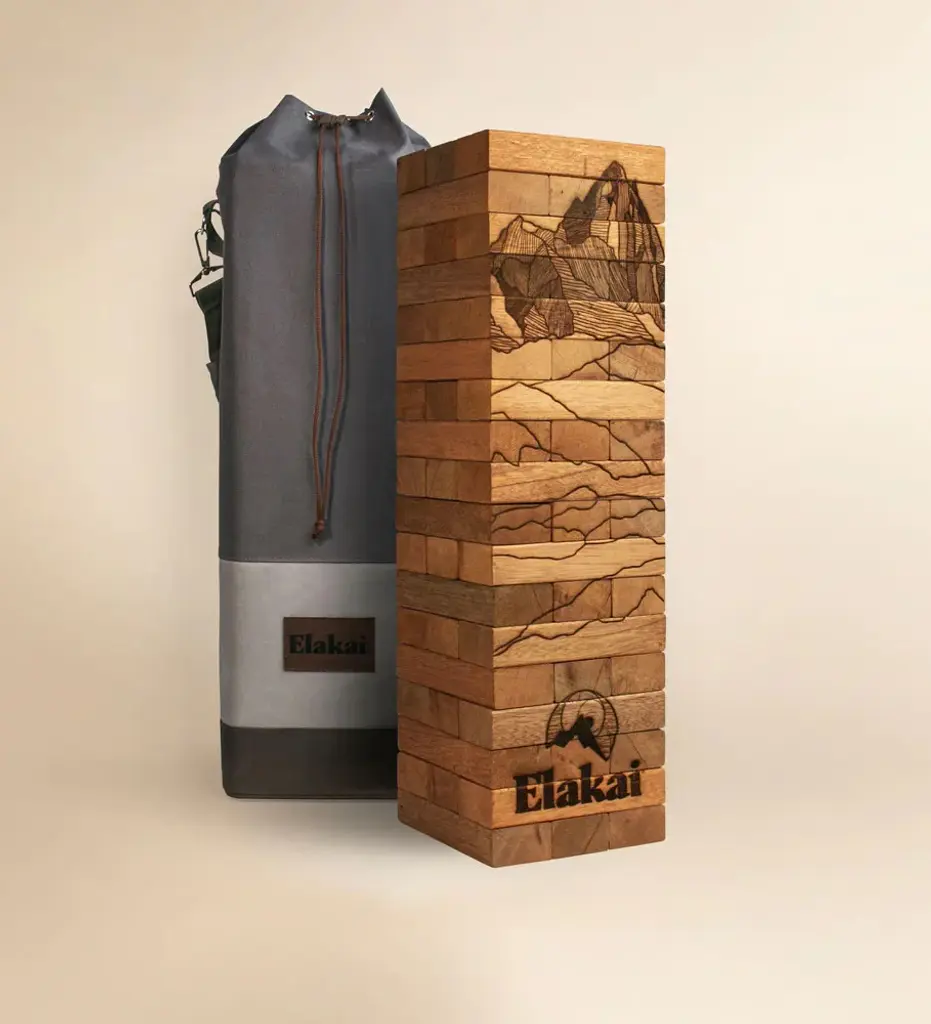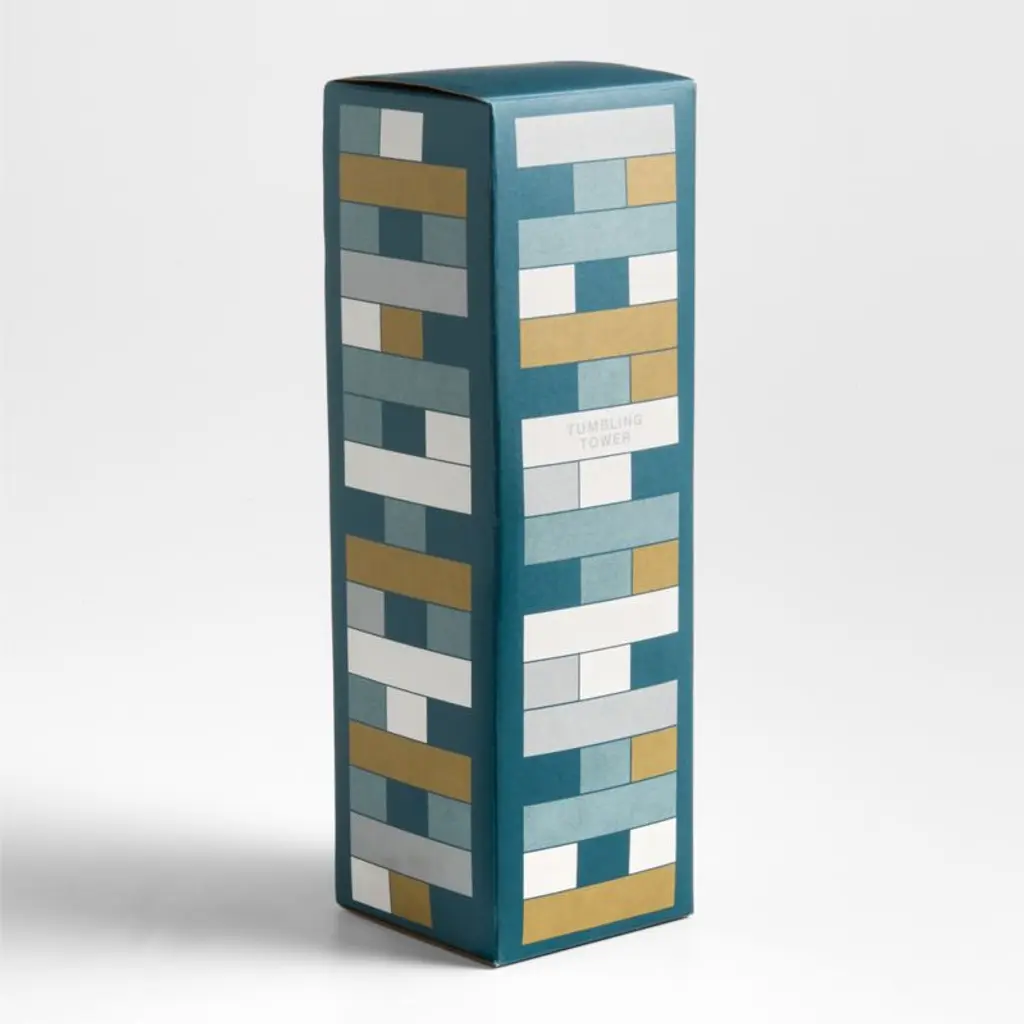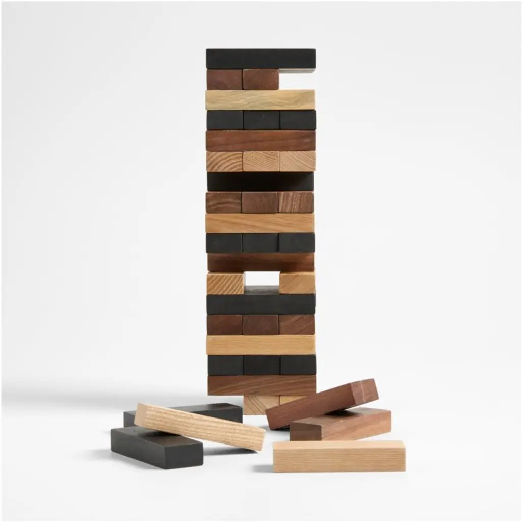 Our fully playable tumbling tower game doubles as a sculptural conversation piece. Made of acacia wood, the set layers rows of playing pieces in three finishesnatural, whitewash and blackened. Using strategic thinking and patience, players remove individual pieces from the structure while attempting to keep it from tumbling down.
