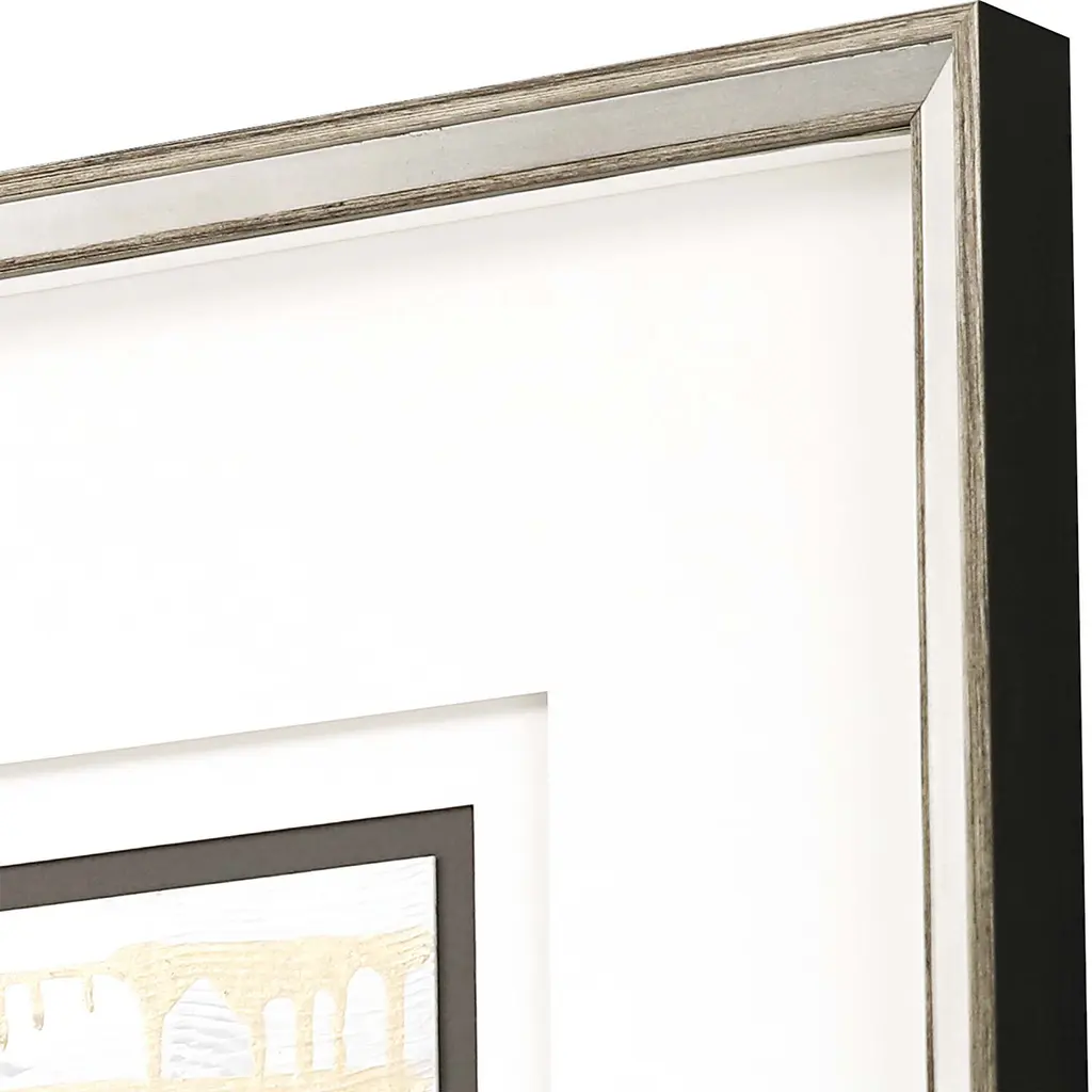 Exclusive hand painted on metal mixed media. Framed in silver leaf wood shadow box style moulding with gold wash edging and black side.
