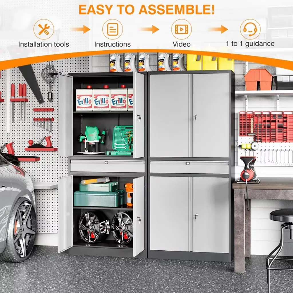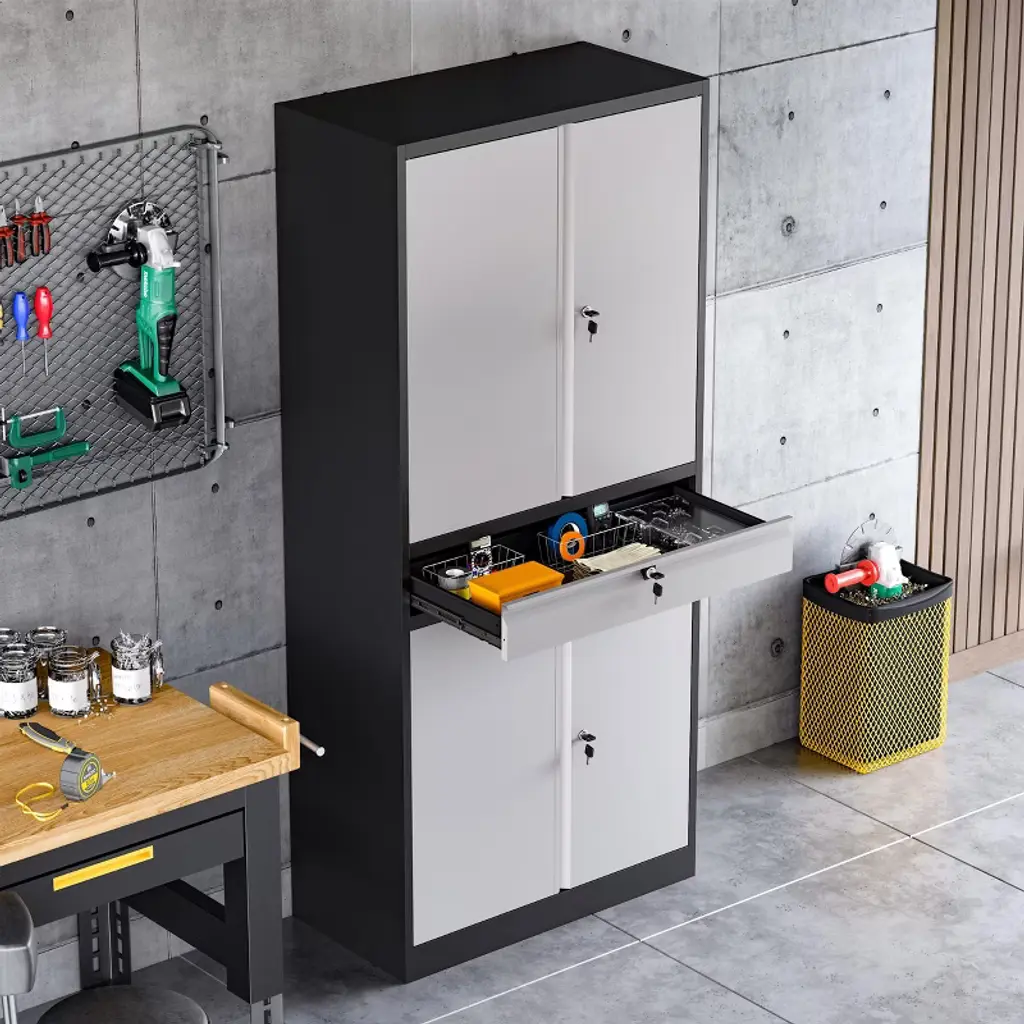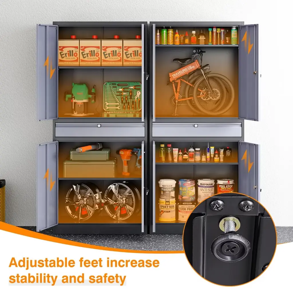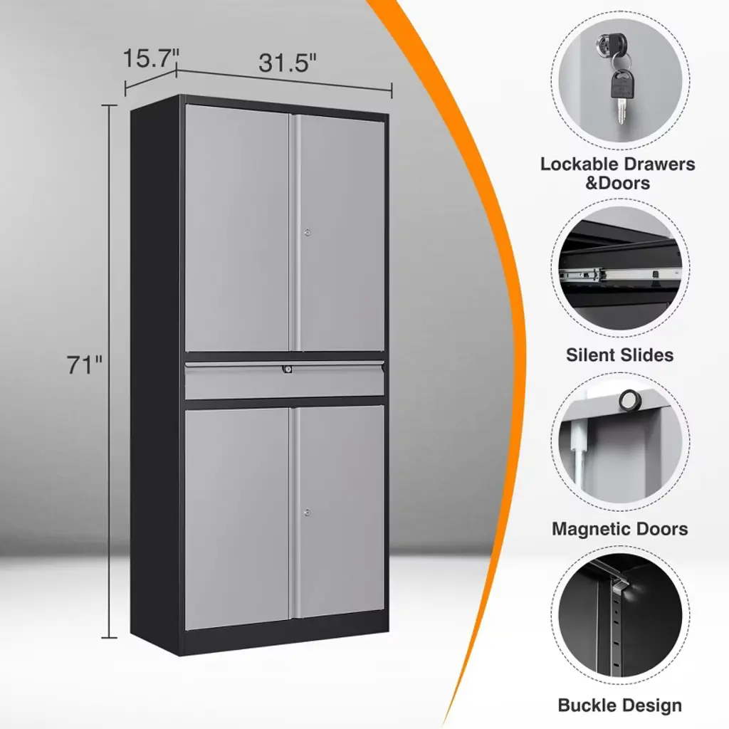 Mlezan 71"metal Garage Cabinet: 4 Doors,1 Drawer,2 Adjustable Shelves,lockable Storage For Garage,home,or Office. Grey&black Finish,durable Design.