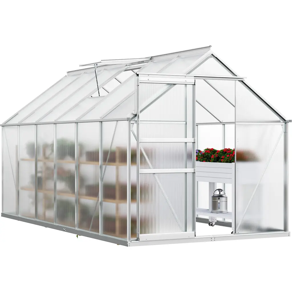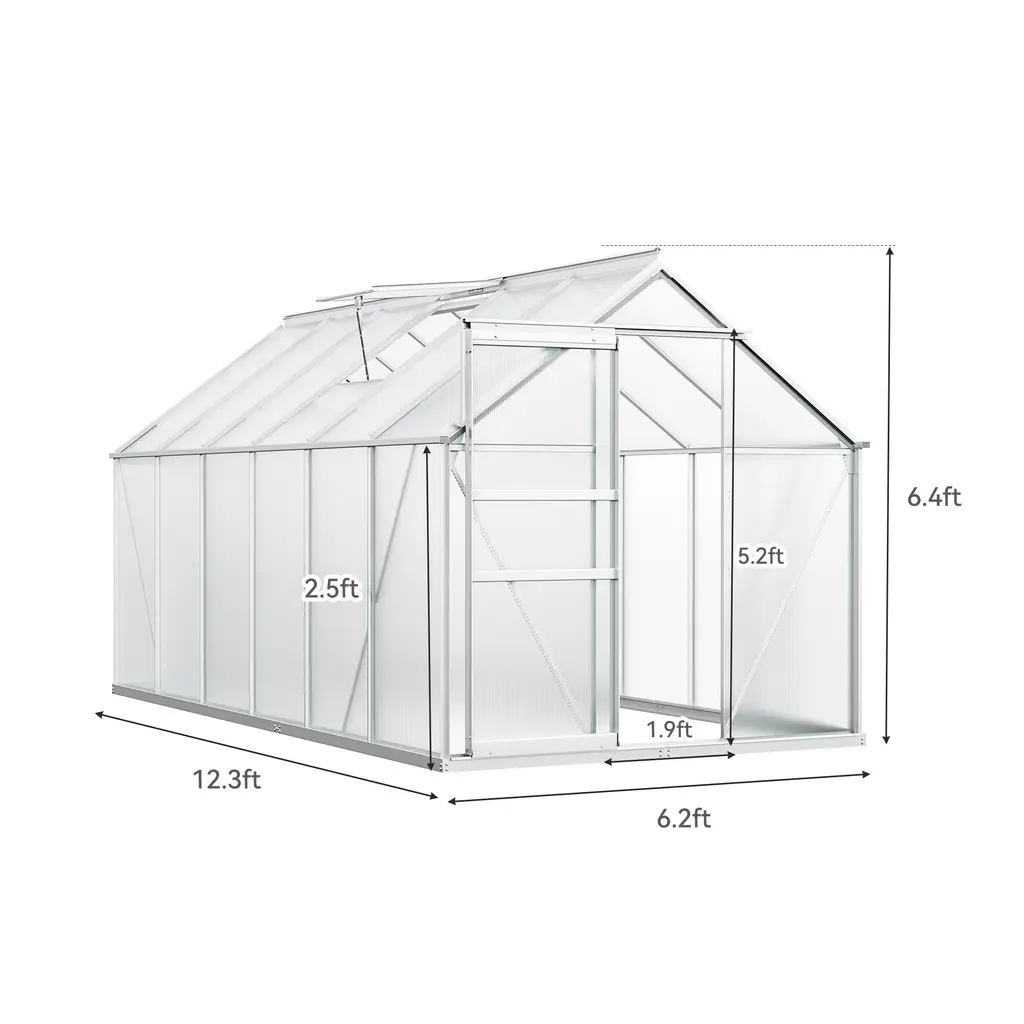Transform your gardening endeavors with our exceptional greenhouse. A rust-proof aluminum frame sits on a galvanized steel base that provides unparalleled durability and weather resistance. 4mm twin-wall PC panels create an effective insulation layer, maintaining a stable and optimal temperature inside, blocking harmful UV rays, and protecting plants from extreme temperatures. The semi-transparent panels allow natural light to diffuse throughout, promoting healthy growth without the risk of overheating. With a convenient sliding door for easy access and a 5-level window adjustment for precise ventilation control, it ensures optimal conditions for plant growth. Extend your growing season, protect your plants from harsh weather, and create an ideal environment for thriving flowers, herbs, and vegetables. We are confident to provide a 1-year manufacturer warranty to ensure your first-rate after-sales experience. Invest in quality and elevate your gardening game with our premium greenhouse today! Features