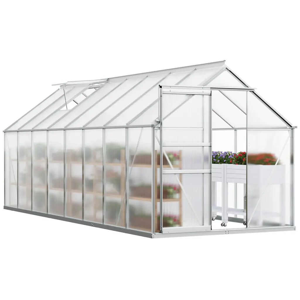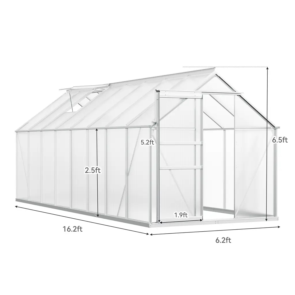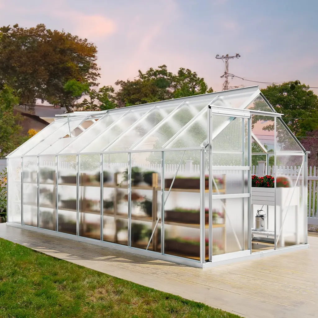 Transform your gardening endeavors with our exceptional greenhouse. A rust-proof aluminum frame sits on a galvanized steel base that provides unparalleled durability and weather resistance. 4mm twin-wall PC panels create an effective insulation layer, maintaining a stable and optimal temperature inside, blocking harmful UV rays, and protecting plants from extreme temperatures. The semi-transparent panels allow natural light to diffuse throughout, promoting healthy growth without the risk of overheating. With a convenient sliding door for easy access and a 5-level window adjustment for precise ventilation control, it ensures optimal conditions for plant growth. Extend your growing season, protect your plants from harsh weather, and create an ideal environment for thriving flowers, herbs, and vegetables. We are confident to provide a 1-year manufacturer warranty to ensure your first-rate after-sales experience. Invest in quality and elevate your gardening game with our premium greenhouse today! Features