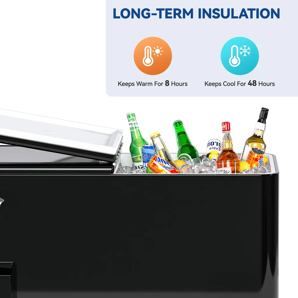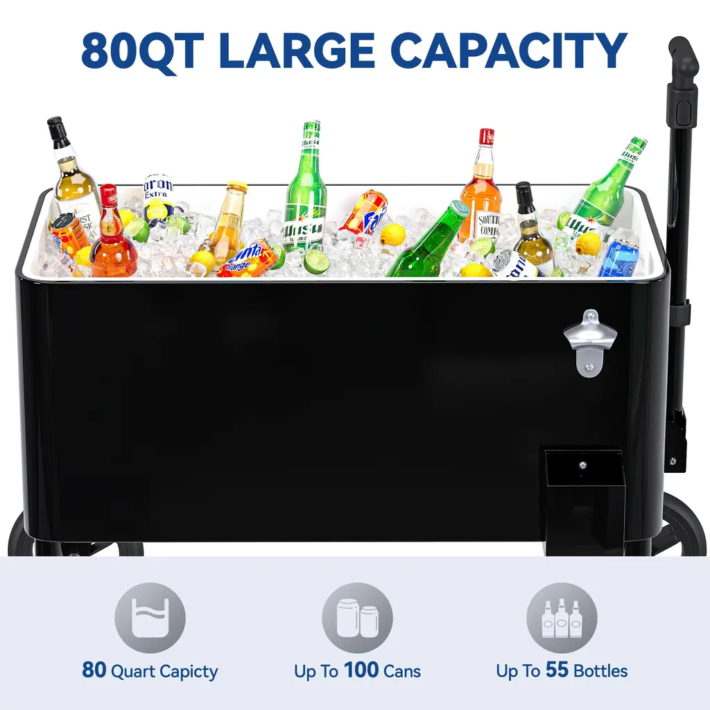 Experience effortless outdoor entertaining with our versatile patio cooler cart. Featuring an adjustable handle, universal wheels, a large 80-quart capacity, a nifty bottle opener, and easy maintenance, this cooler ensures you have everything you need to keep your beverages cool or warm for any outdoor occasion.The cooler cart is equipped with an ergonomic adjustable handle that can be tailored to your preferred length. Ideal for transporting a substantial amount of food and drinks with ease, this feature enhances convenience during use.With an enlarged wheel design, this outdoor cooler can navigate a variety of terrains and locations effortlessly. The 360° rotation capability ensures smooth mobility in any direction, making transportation a breeze wherever you go.Offering a spacious 80-quart capacity, this patio cooler can store over 100 cans or 55+ bottles, keeping them cool for up to 48 hours or warm for up to 8 hours. It's the perfect solution for storing and chilling a wide selection of beverages for outdoor gatherings and events.Designed for convenience, our portable cooler features a built-in bottle opener with a bottle cap catcher attached on the side. Easily open bottles and collect caps in one seamless motion, adding practicality to your outdoor experience.The drain plug on our standing cooler facilitates easy cleaning by removing excess water. The hassle-free installation process requires no additional tools, ensuring straightforward setup and care for your convenience.
