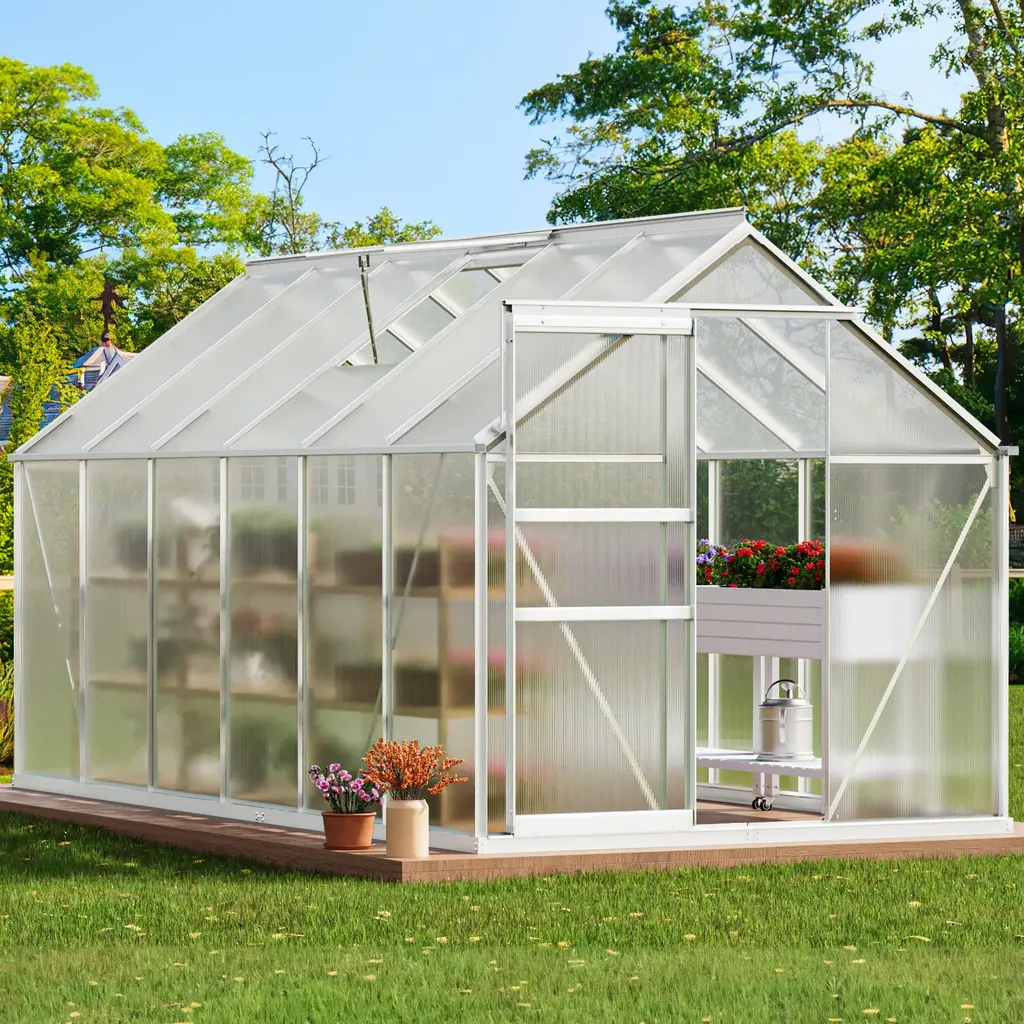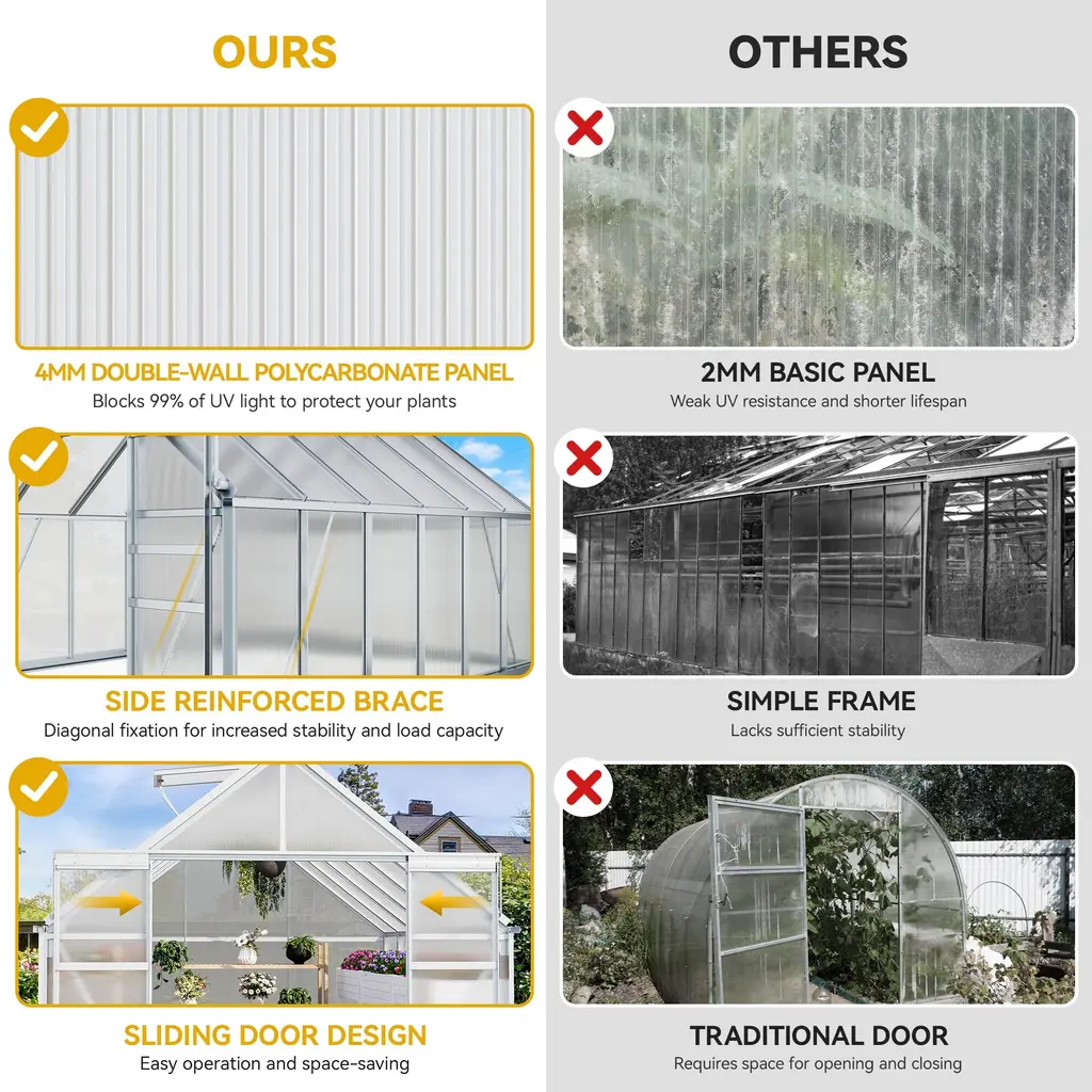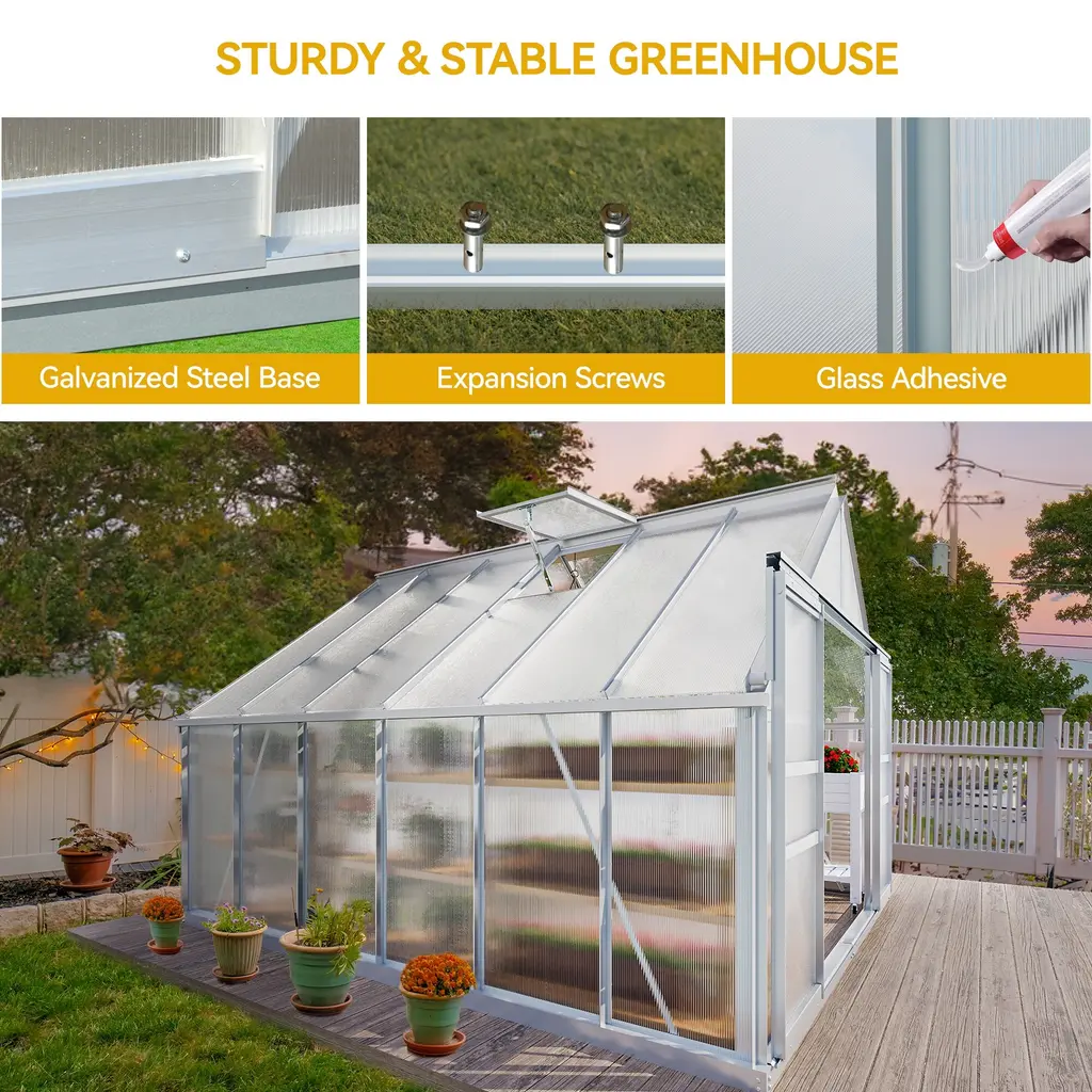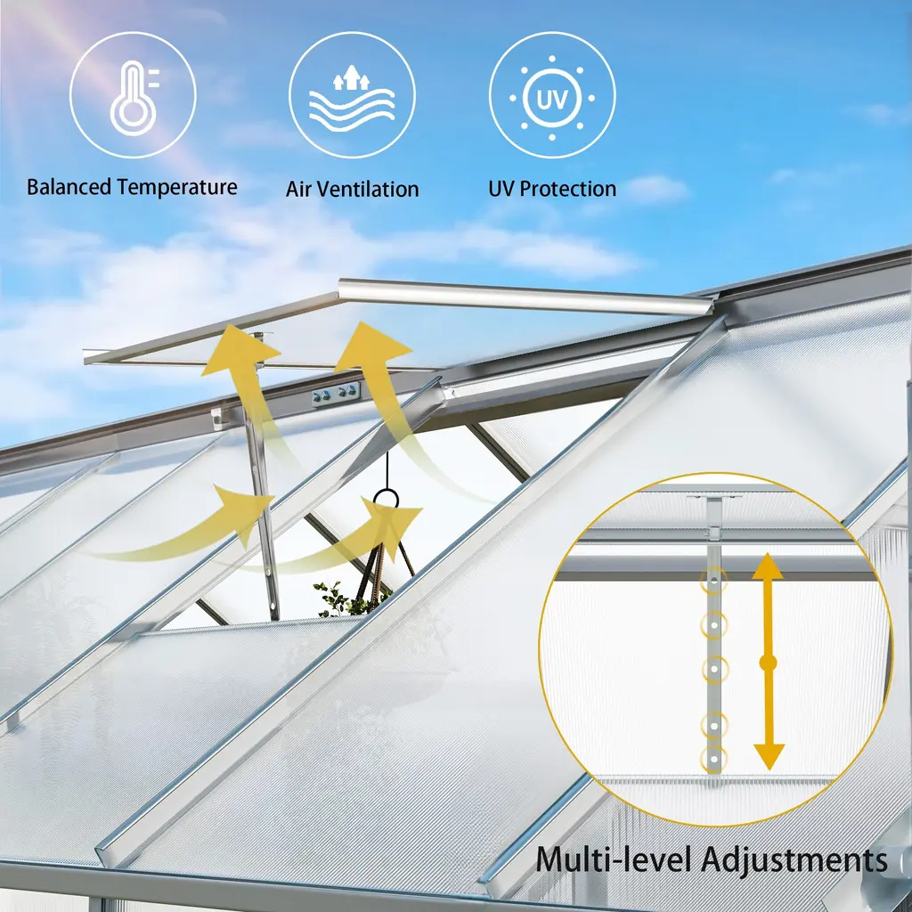 Transform your gardening endeavors with our exceptional greenhouse. A rust-proof aluminum frame sits on a galvanized steel base that provides unparalleled durability and weather resistance. 4mm twin-wall PC panels create an effective insulation layer, maintaining a stable and optimal temperature inside, blocking harmful UV rays, and protecting plants from extreme temperatures. The semi-transparent panels allow natural light to diffuse throughout, promoting healthy growth without the risk of overheating. With a convenient sliding door for easy access and a 5-level window adjustment for precise ventilation control, it ensures optimal conditions for plant growth. Extend your growing season, protect your plants from harsh weather, and create an ideal environment for thriving flowers, herbs, and vegetables. We are confident to provide a 1-year manufacturer warranty to ensure your first-rate after-sales experience. Invest in quality and elevate your gardening game with our premium greenhouse today! Features