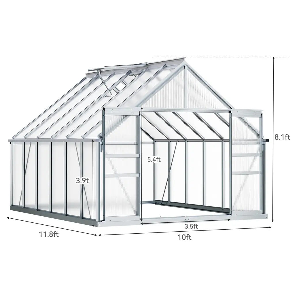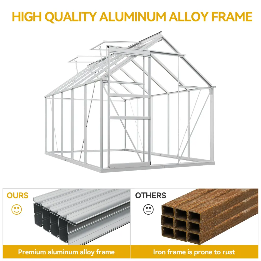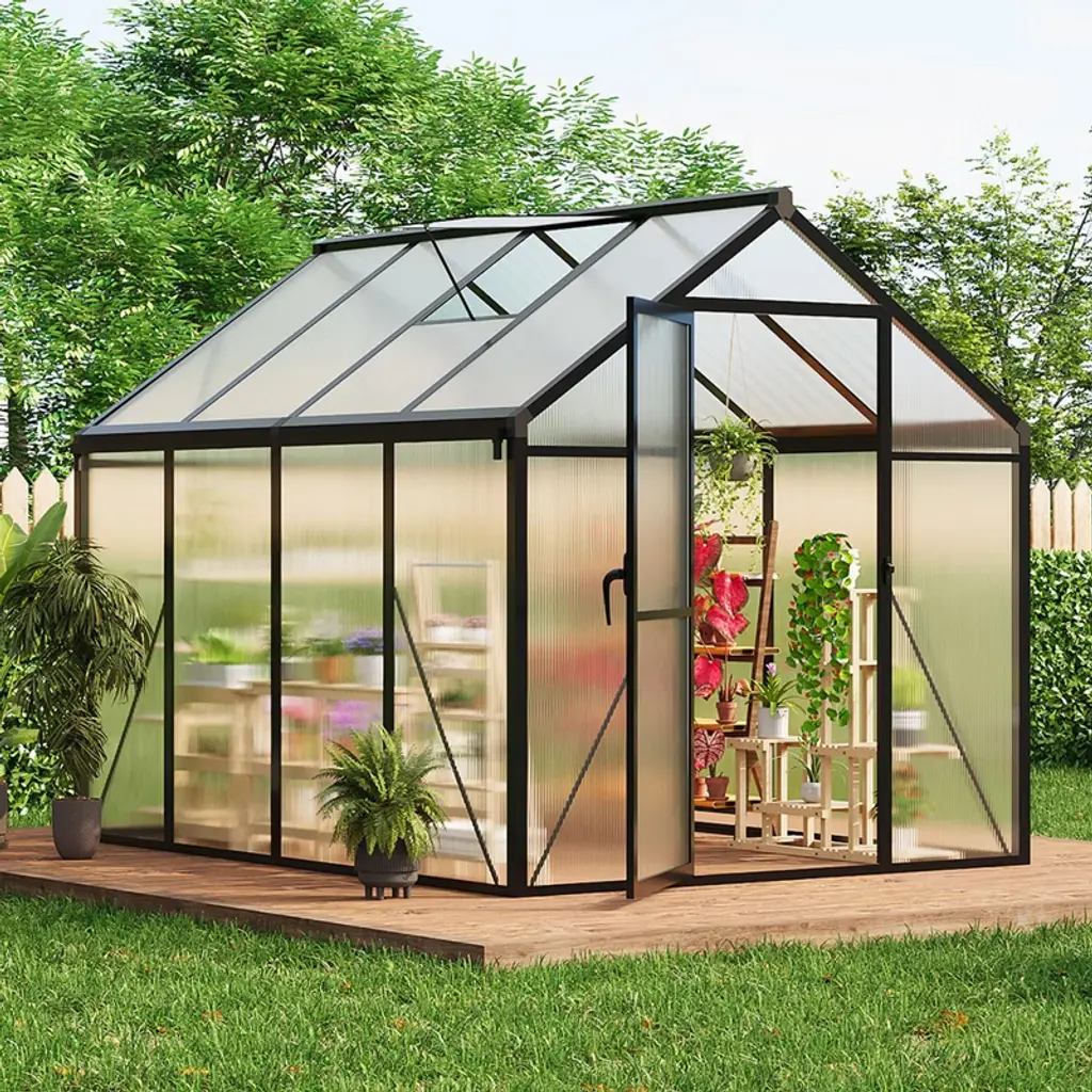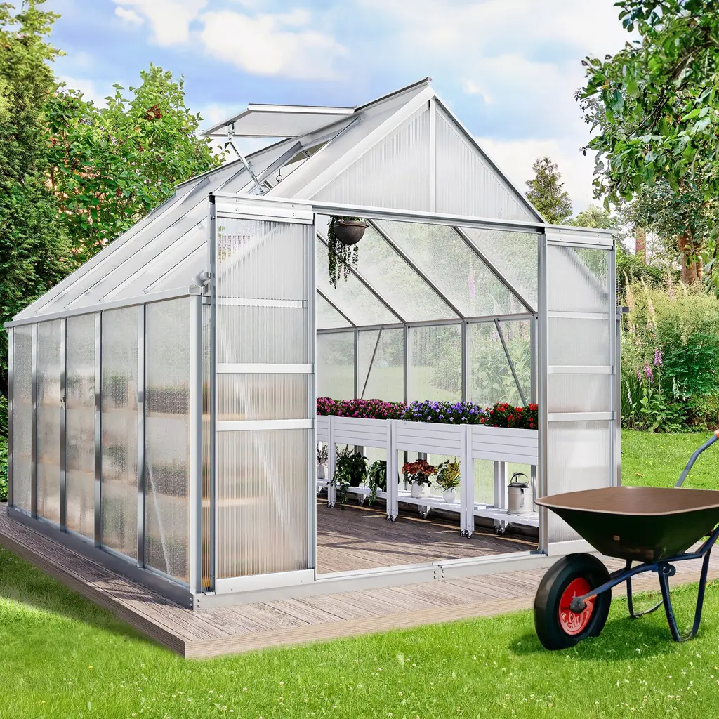 Transform your gardening endeavors with our exceptional greenhouse. A rust-proof aluminum frame sits on a galvanized steel base that provides unparalleled durability and weather resistance. 4mm twin-wall PC panels create an effective insulation layer, maintaining a stable and optimal temperature inside, blocking harmful UV rays, and protecting plants from extreme temperatures. The semi-transparent panels allow natural light to diffuse throughout, promoting healthy growth without the risk of overheating. With a convenient sliding door for easy access and a 5-level window adjustment for precise ventilation control, it ensures optimal conditions for plant growth. Extend your growing season, protect your plants from harsh weather, and create an ideal environment for thriving flowers, herbs, and vegetables. We are confident to provide a 1-year manufacturer warranty to ensure your first-rate after-sales experience. Invest in quality and elevate your gardening game with our premium greenhouse today! Features