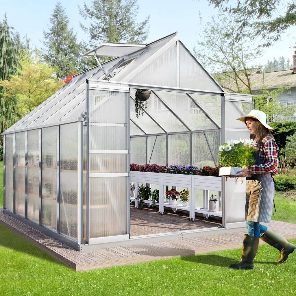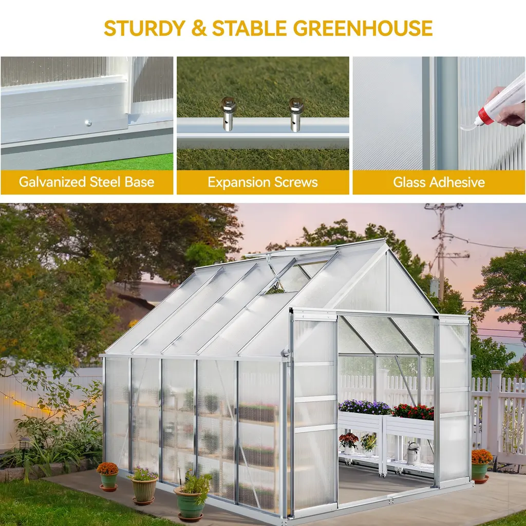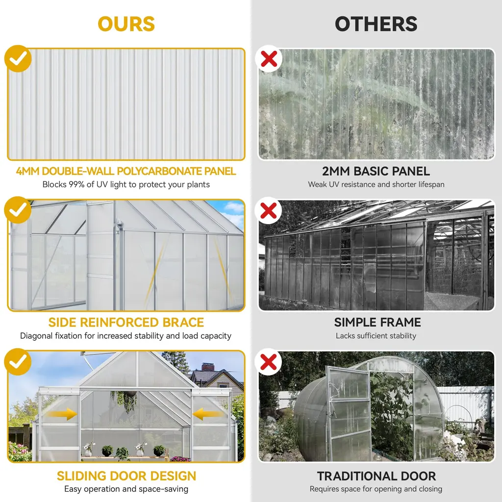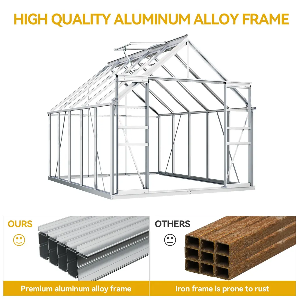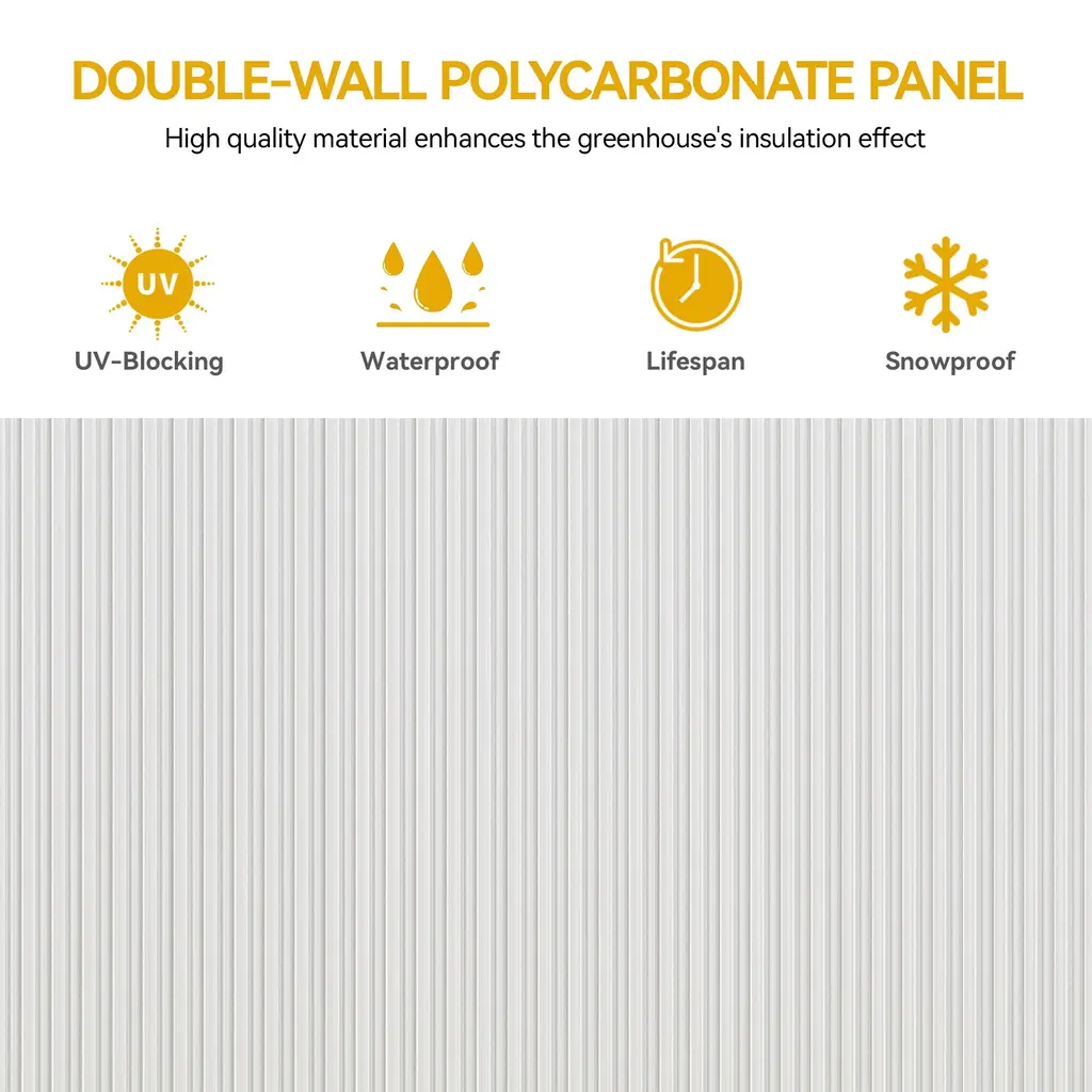 Transform your gardening endeavors with our exceptional greenhouse. A rust-proof aluminum frame sits on a galvanized steel base that provides unparalleled durability and weather resistance. 4mm twin-wall PC panels create an effective insulation layer, maintaining a stable and optimal temperature inside, blocking harmful UV rays, and protecting plants from extreme temperatures. The semi-transparent panels allow natural light to diffuse throughout, promoting healthy growth without the risk of overheating. With a convenient sliding door for easy access and a 5-level window adjustment for precise ventilation control, it ensures optimal conditions for plant growth. Extend your growing season, protect your plants from harsh weather, and create an ideal environment for thriving flowers, herbs, and vegetables. We are confident to provide a 1-year manufacturer warranty to ensure your first-rate after-sales experience. Invest in quality and elevate your gardening game with our premium greenhouse today! Features