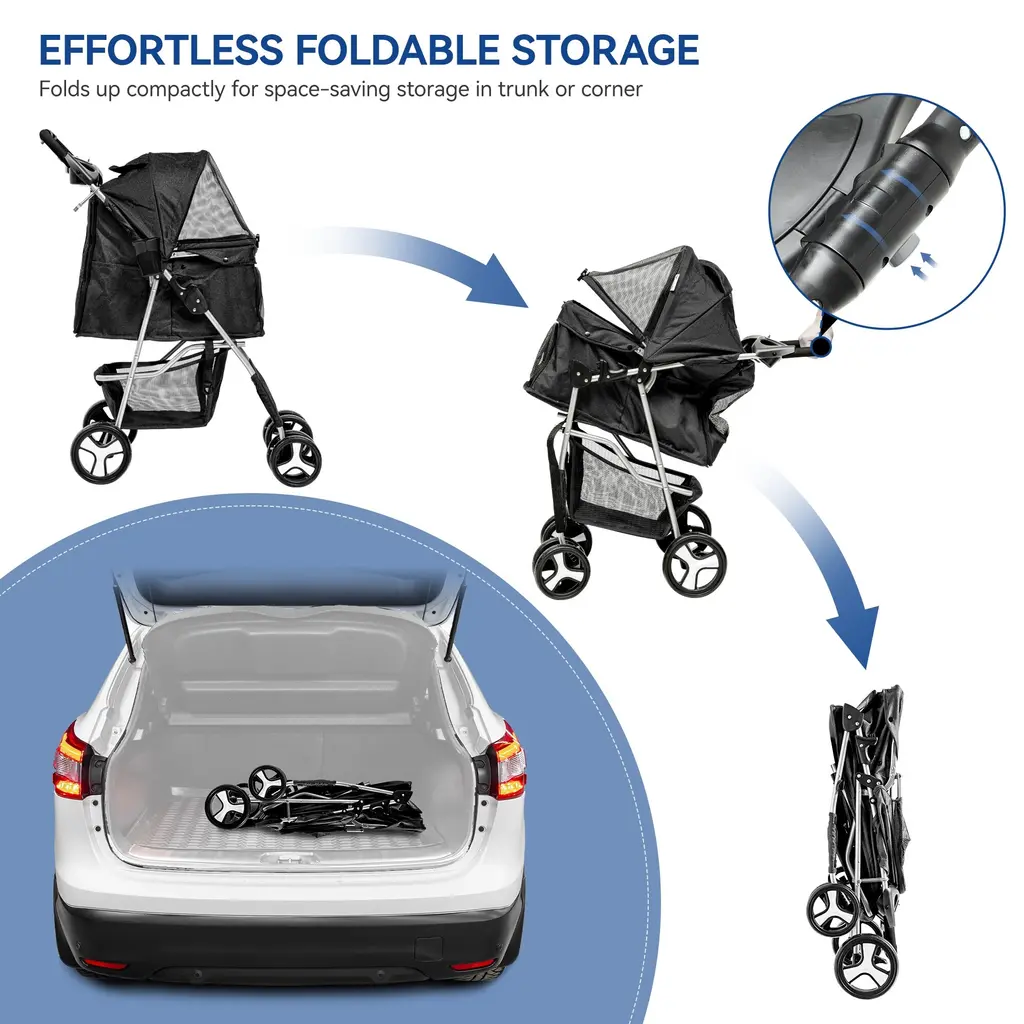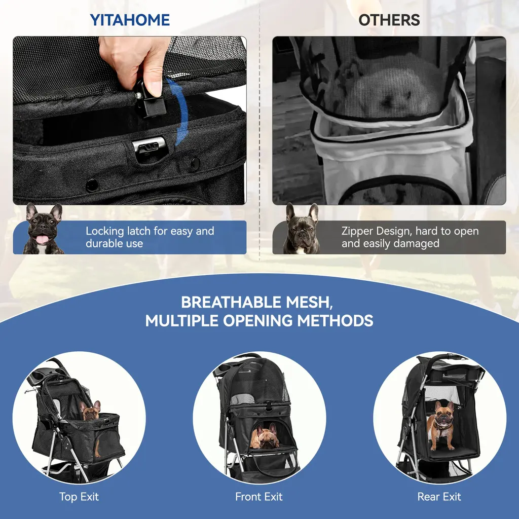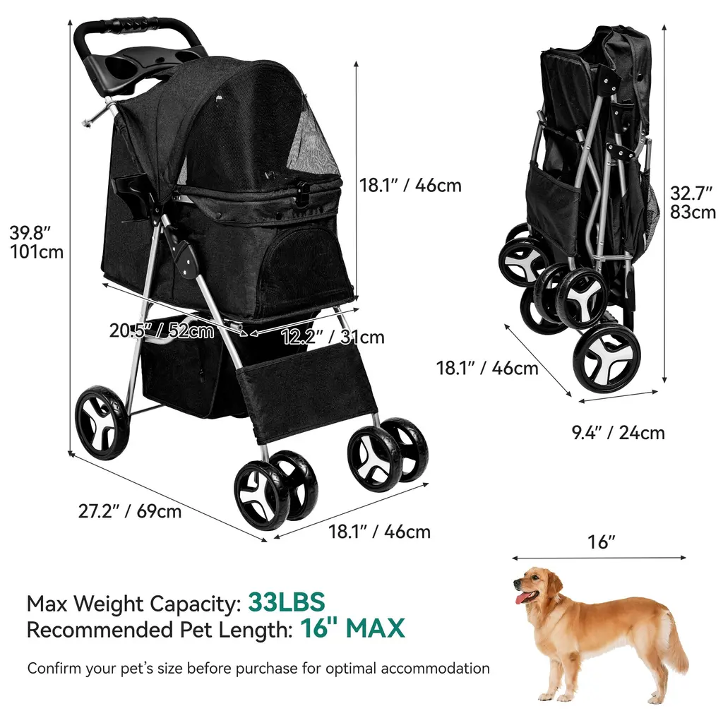 Our stroller adopting a brand-new latch locking system helps simplify the process of putting your pet into and zipping up. This uniquely designed cat stroller is ideal for pet owners, it has a fun design with 3 positionable canopies, and its low profile, compact design makes it easy to fold and fit in an overhead airplane suitcase or even the trunk of the smallest car with just one hand. Take your friends with you. It can go anywhere. Features: