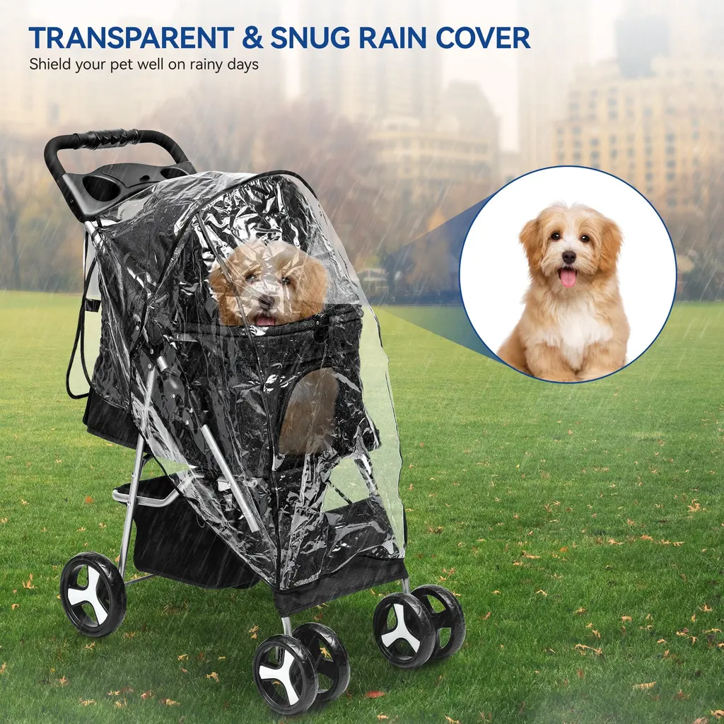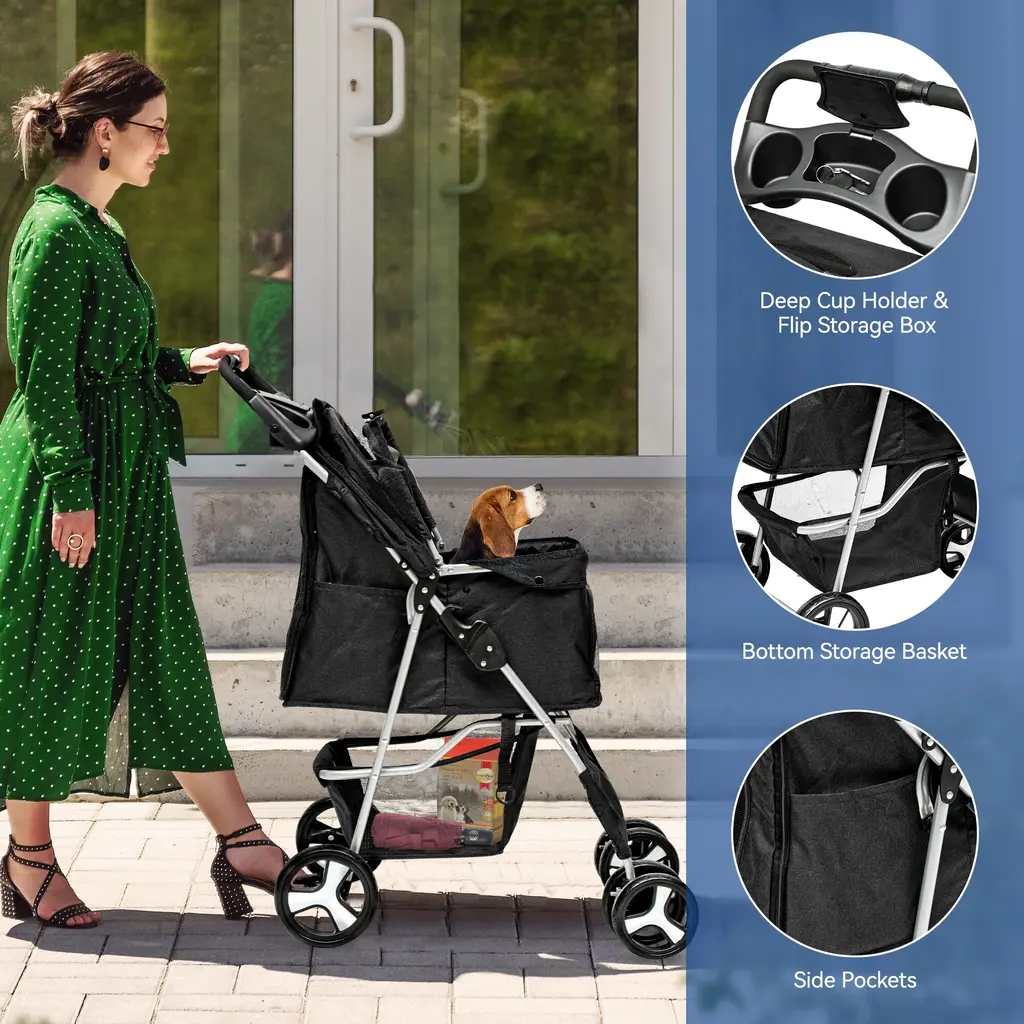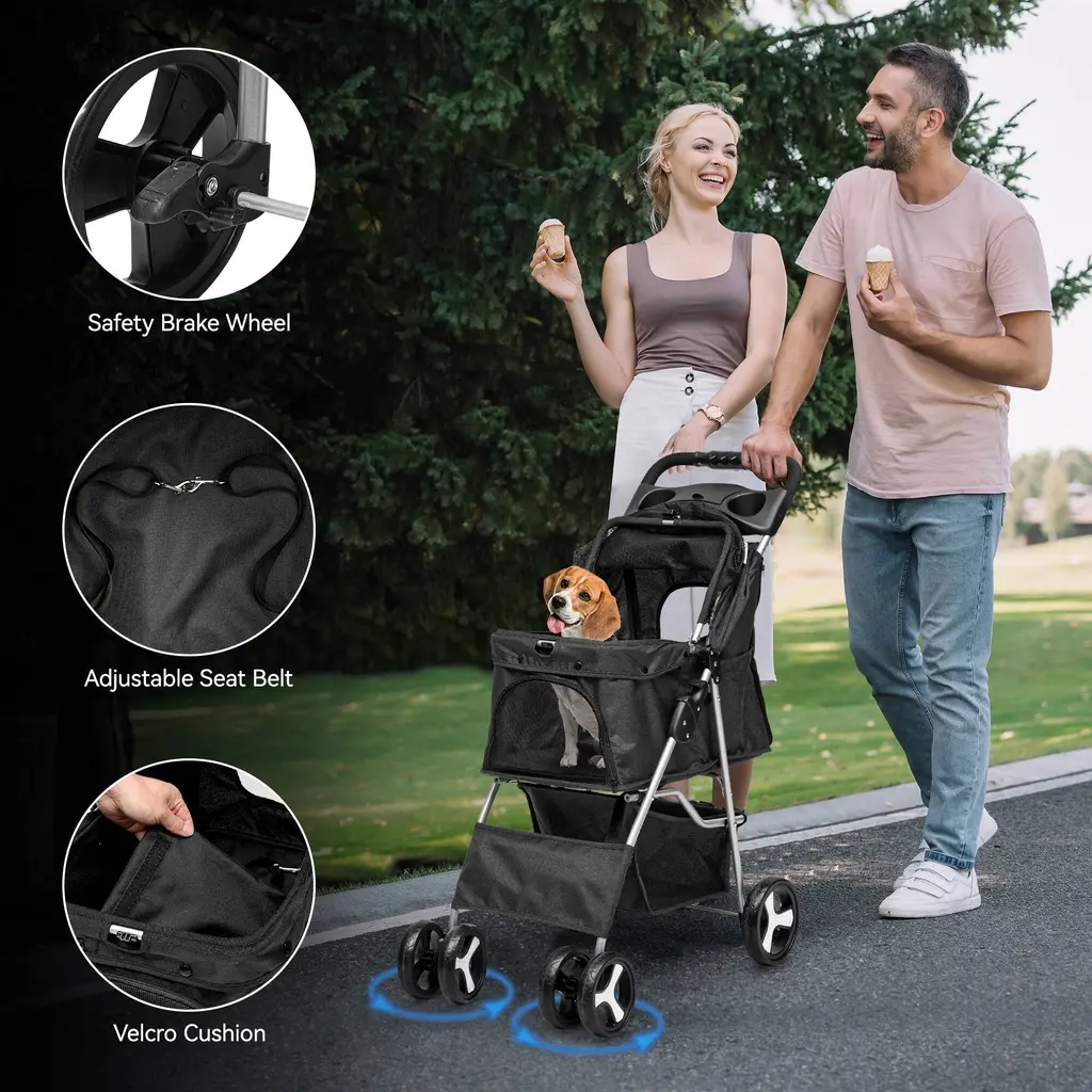 Our stroller adopting a brand-new latch locking system helps simplify the process of putting your pet into and zipping up. This uniquely designed cat stroller is ideal for pet owners, it has a fun design with 3 positionable canopies, and its low profile, compact design makes it easy to fold and fit in an overhead airplane suitcase or even the trunk of the smallest car with just one hand. Take your friends with you. It can go anywhere. Features:
