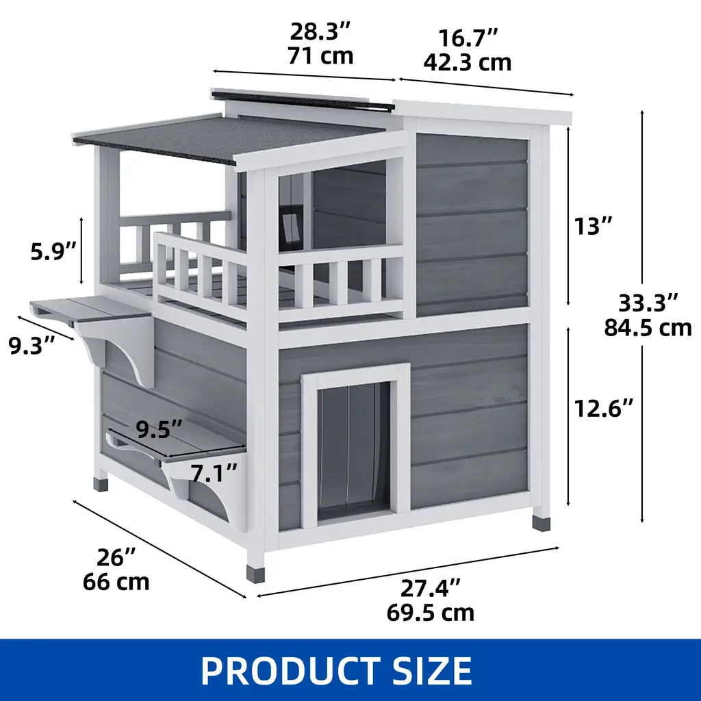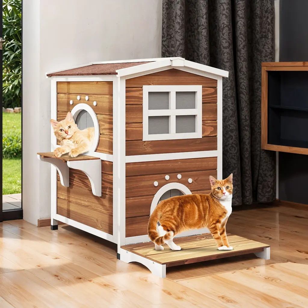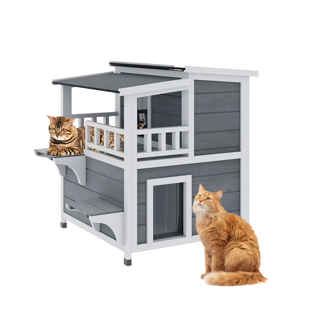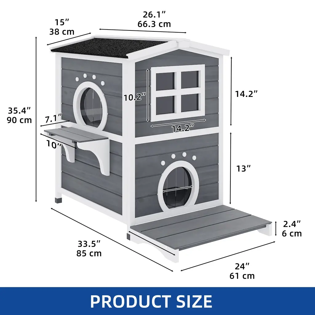 Our Two-Story Outdoor Cat House is the ultimate dream home for your feline friends. This spacious 24"L x 26"W x 35.4"H house is designed for the comfort of two cats, with ample room to stretch and play. It features a rear door for simple entry, an acrylic window for natural light, and a roof that opens for easy cleaning. The first floor's terrace invites cats to enjoy the outdoors, while the elevated design keeps them safe from insects, moisture, and cold. The house's layout is fully adjustable with a removable floor panel, providing the perfect balance of togetherness and privacy. Made from pine wood and a waterproof roof, it's built to withstand the test of time and weather. Features: