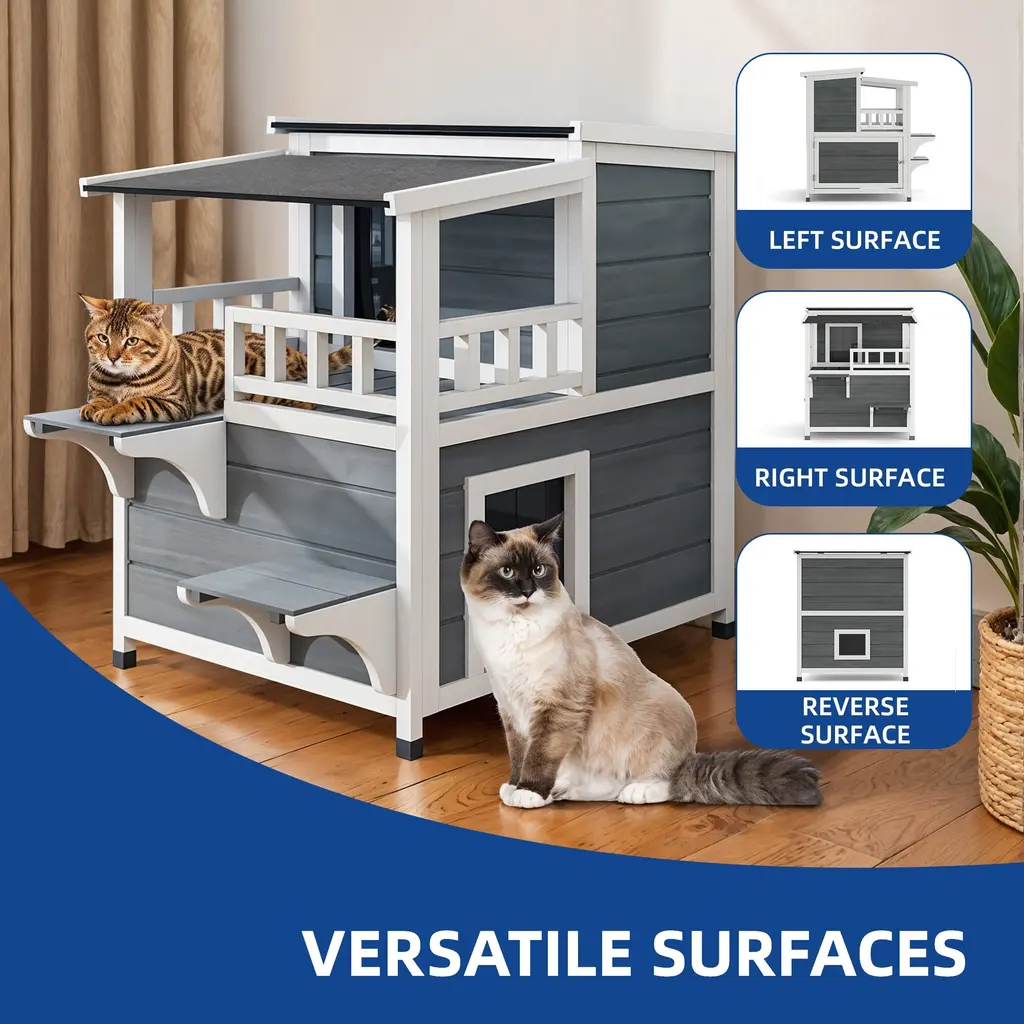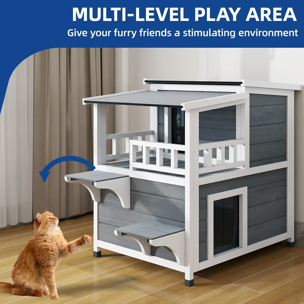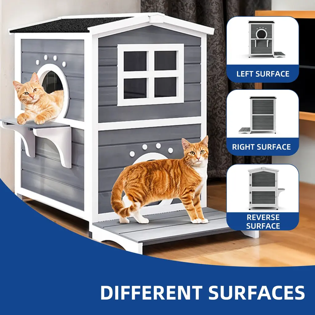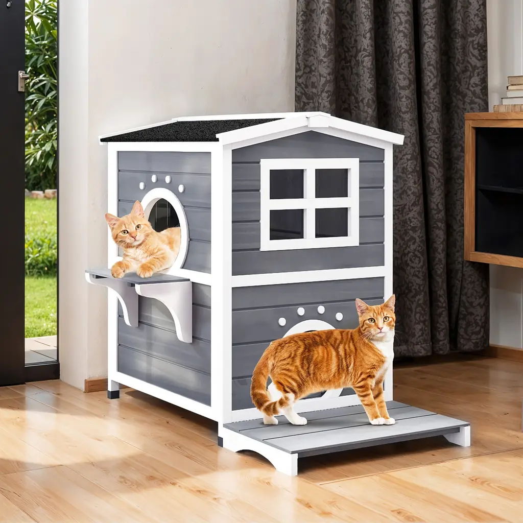Our Two-Story Outdoor Cat House is the ultimate dream home for your feline friends. This spacious 24"L x 26"W x 35.4"H house is designed for the comfort of two cats, with ample room to stretch and play. It features a rear door for simple entry, an acrylic window for natural light, and a roof that opens for easy cleaning. The first floor's terrace invites cats to enjoy the outdoors, while the elevated design keeps them safe from insects, moisture, and cold. The house's layout is fully adjustable with a removable floor panel, providing the perfect balance of togetherness and privacy. Made from pine wood and a waterproof roof, it's built to withstand the test of time and weather. Features: