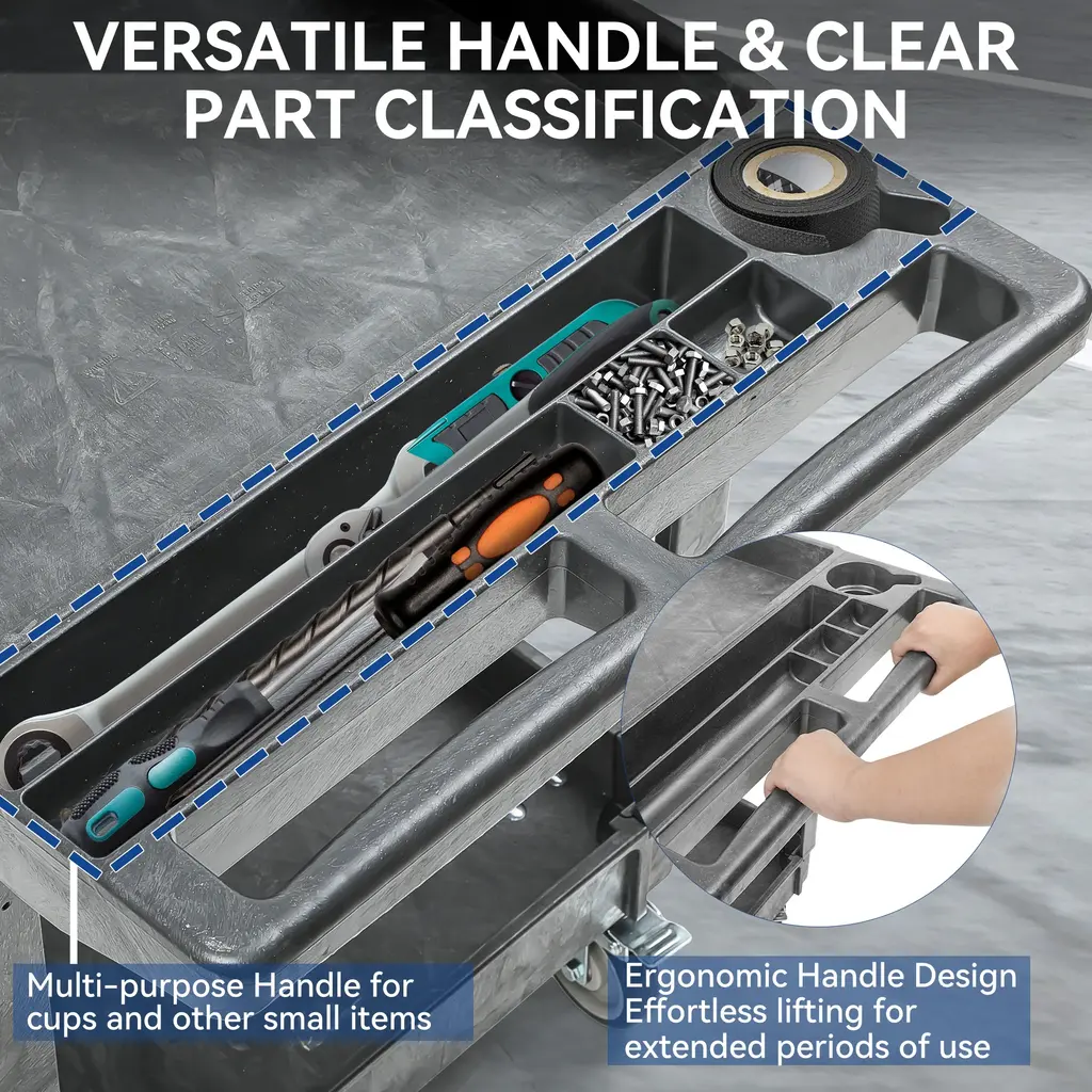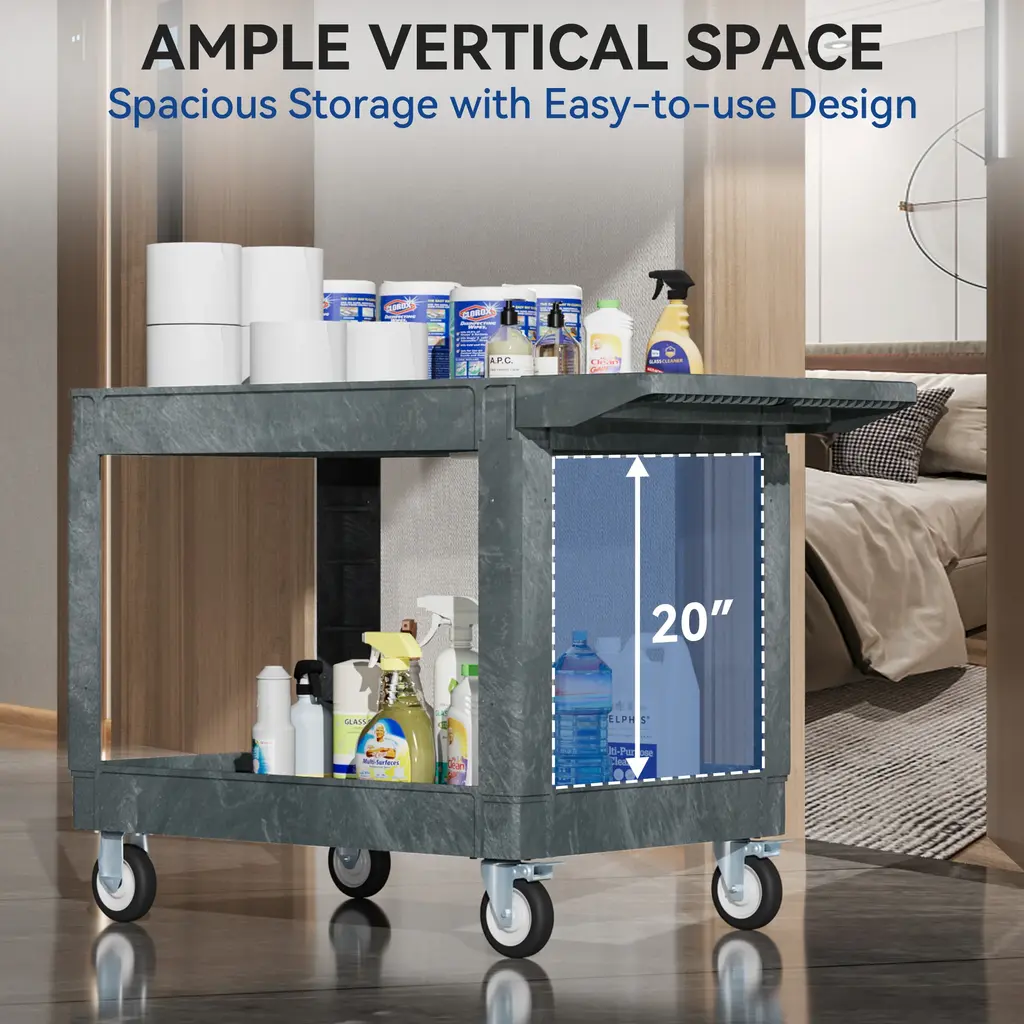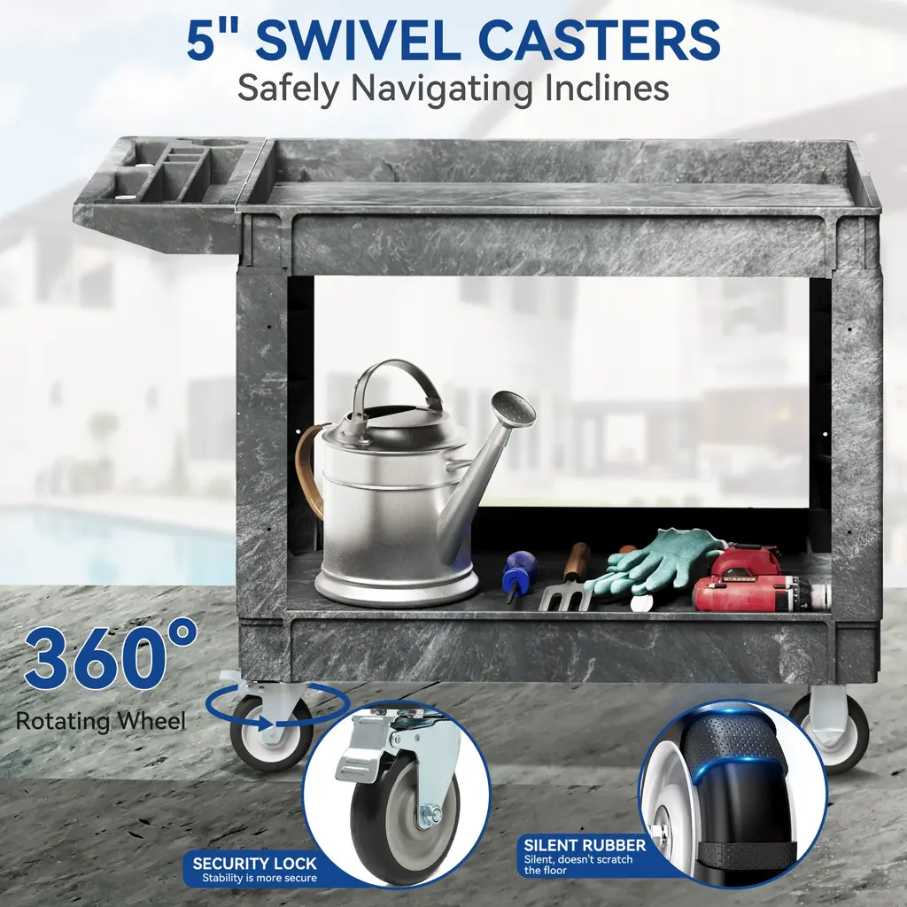 Introducing our versatile utility cart! This cart boasts a weight capacity of up to 550 pounds and is designed with a spacious, dual-layer structure and sturdy 5-inch swivel casters for smooth and easy movement. Whether you need to transport goods around a warehouse or office, our utility cart is the perfect tool to make your job easier and more efficient. With its lightweight and portable design, you can easily move the cart from one location to another, allowing you to customize it to meet your specific needs. Plus, with our current promotion, you can enjoy great savings on this reliable and durable cart. Don't miss out on this opportunity to make your workday easier and more enjoyable!