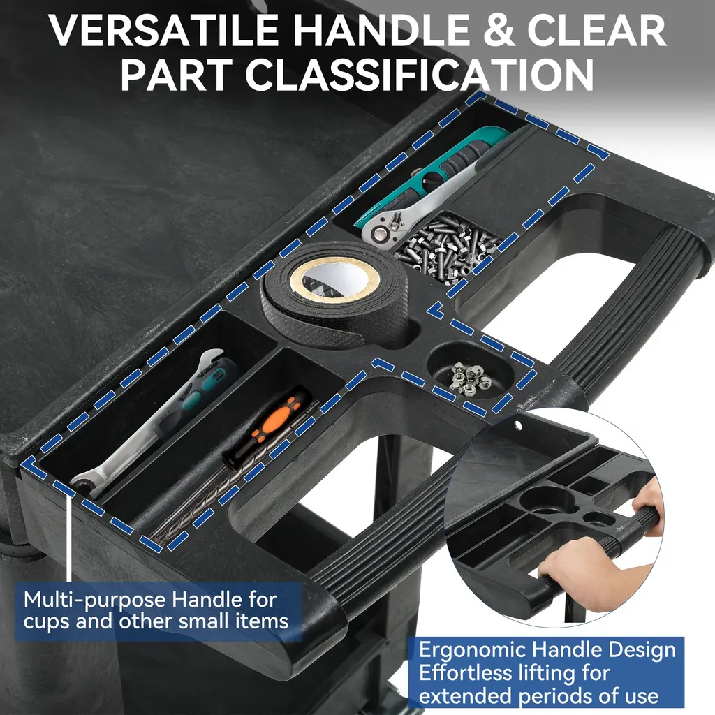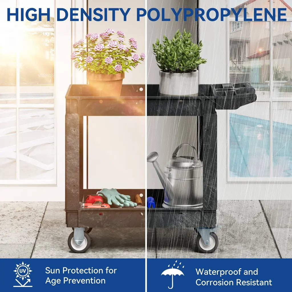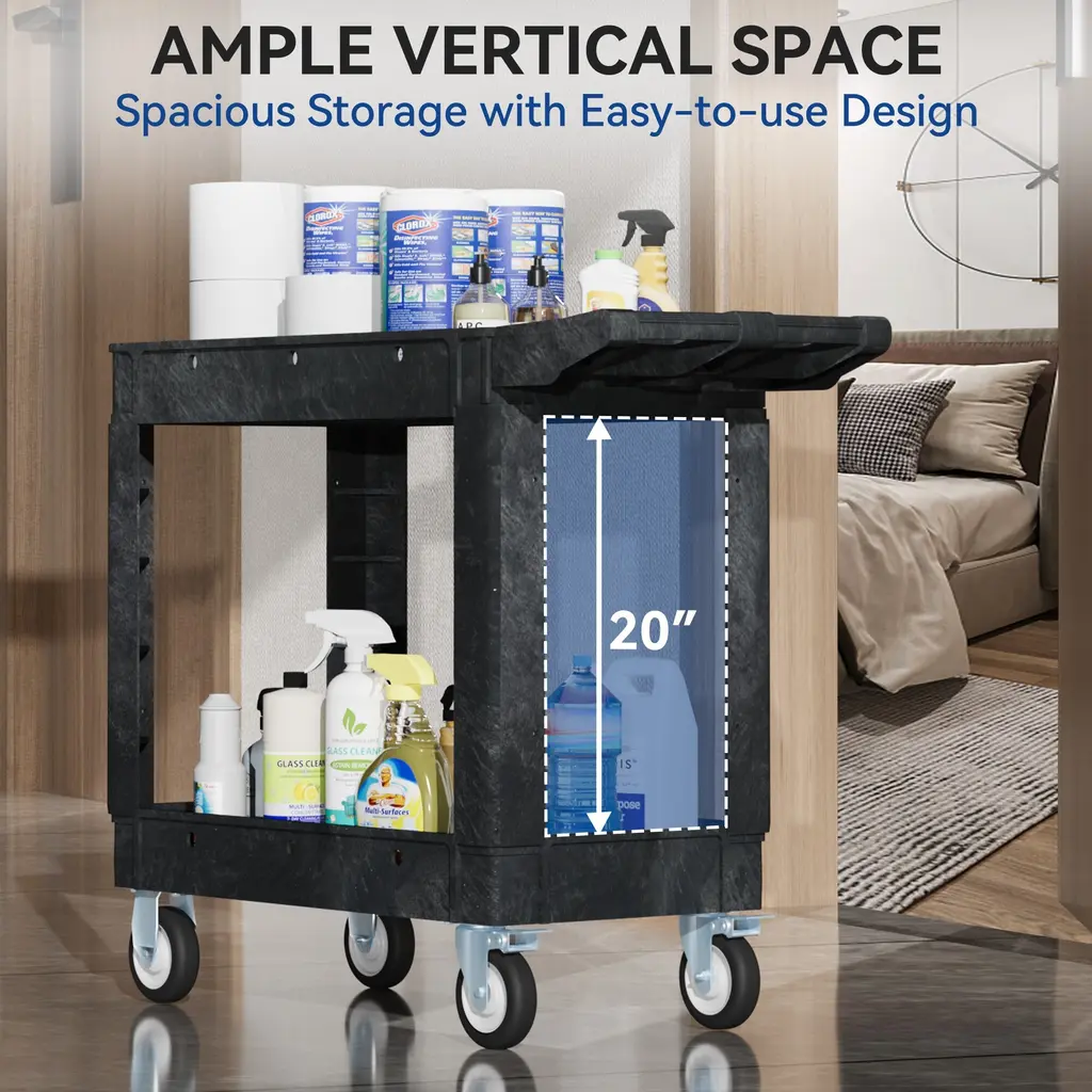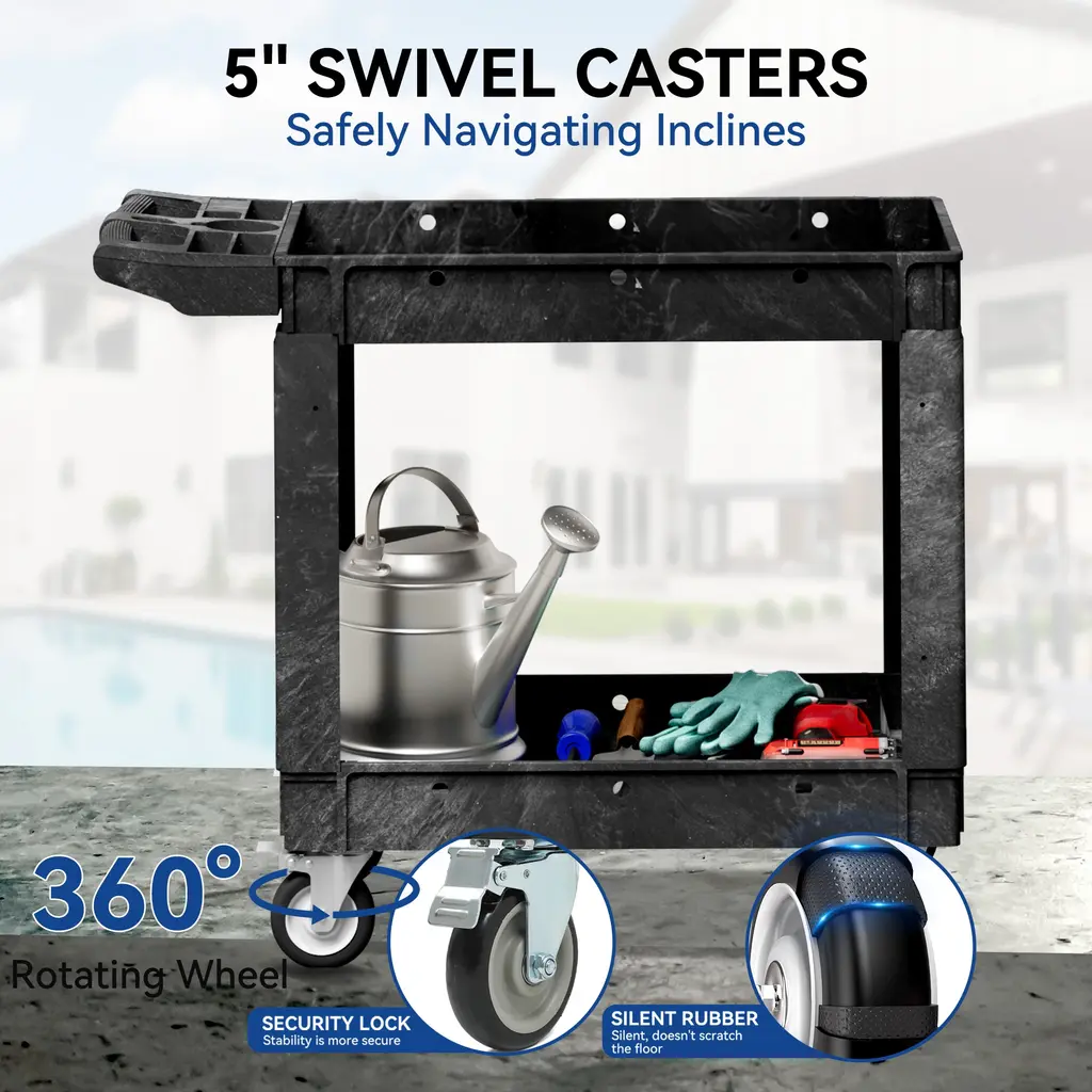 Introducing our versatile utility cart! This cart boasts a weight capacity of up to 550 pounds and is designed with a spacious, dual-layer structure and sturdy 5-inch swivel casters for smooth and easy movement. Whether you need to transport goods around a warehouse or office, our utility cart is the perfect tool to make your job easier and more efficient. With its lightweight and portable design, you can easily move the cart from one location to another, allowing you to customize it to meet your specific needs. Plus, with our current promotion, you can enjoy great savings on this reliable and durable cart. Don't miss out on this opportunity to make your workday easier and more enjoyable!