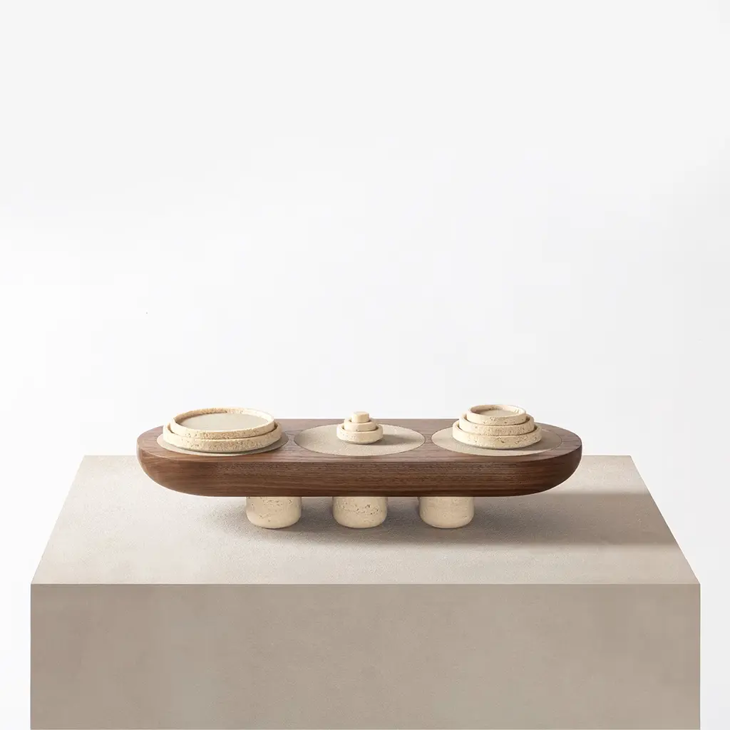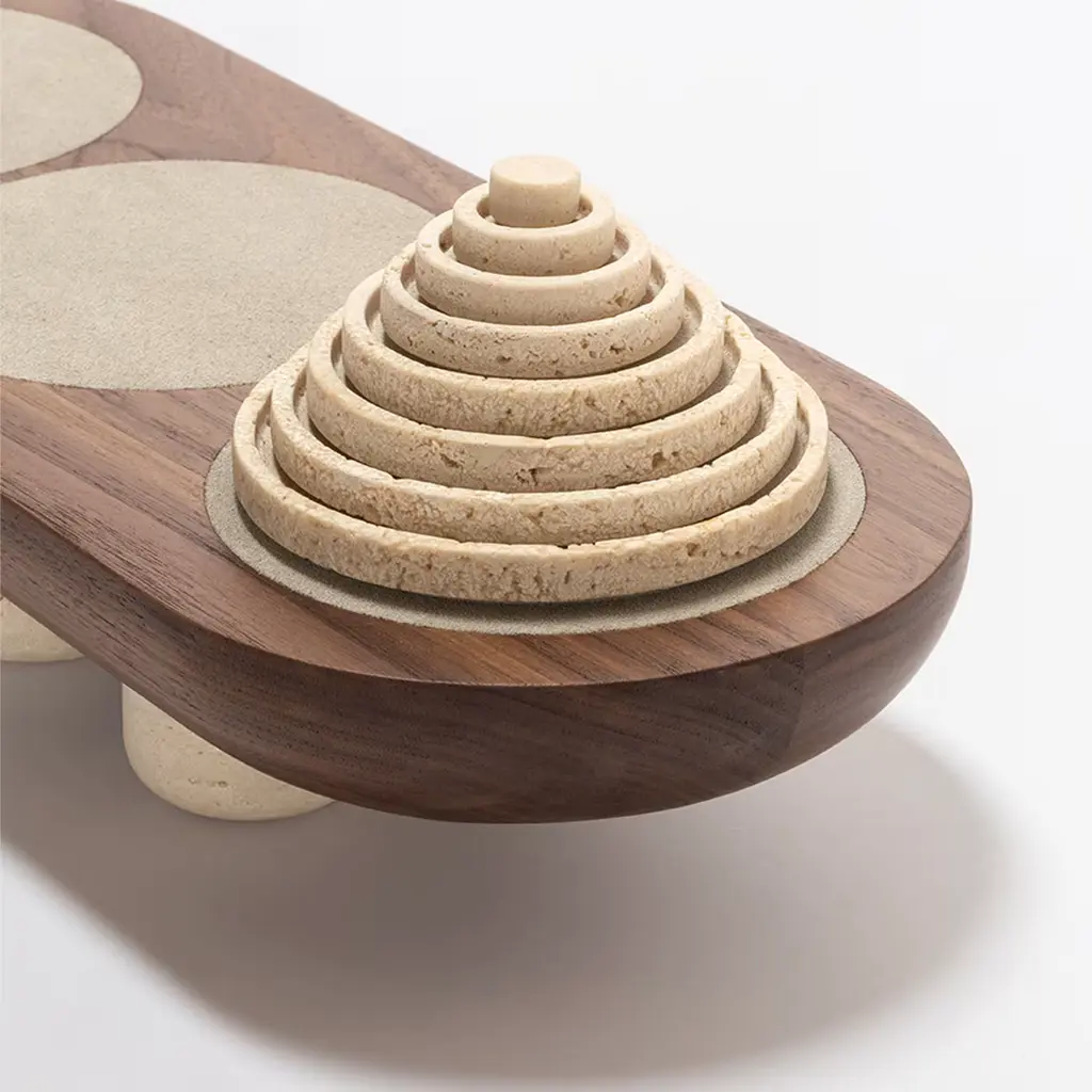 Large volumes in wood and stone are carved and sculpted to create playing fields with modeled, almost primitive lines. Connection and reflection creations that define everyday landscape. Solid walnut wood top with leather inserts standing on three marble legs. The set is equipped with marble playing pieces featuring in their turn fine leather inserts. Marble finishes available: AR - arabescato white, TR - travertino.