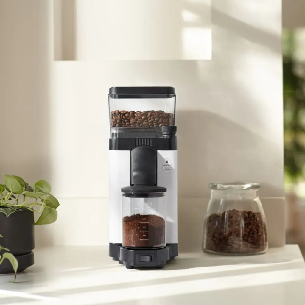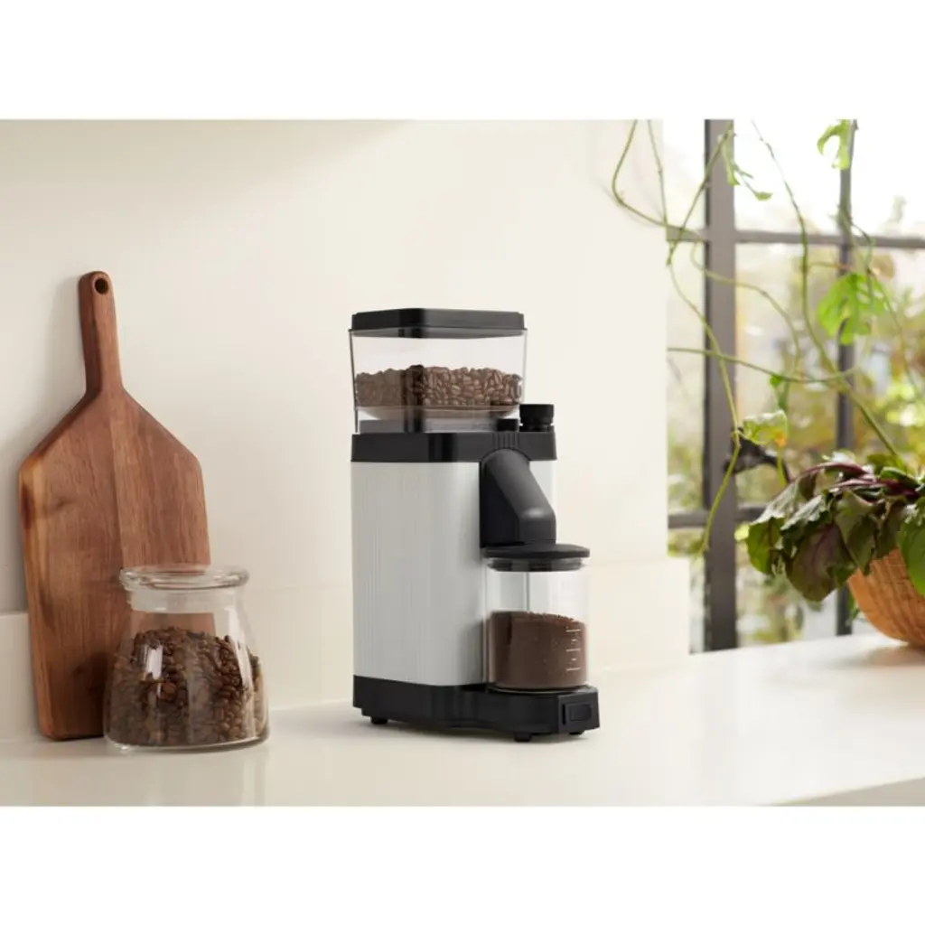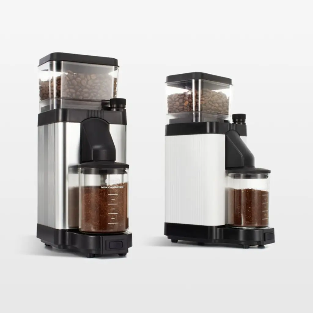 Designed by Moccamaster to meet the company's exacting standards for brewing coffee, this burr grinder guarantees the quality and uniformity of the grind for perfectly extracted coffee. Flat steel burrs deliver a highly precise and uniform grind, and the stepless knob allows for the finest adjustments to create exactly the right size grind for specific brewing methods from medium-fine drip to cold brew. The static-reducing spout delivers mess-free grounds into a glass container with an optional storage lid to keep left-over grounds fresh. The matte white burr grinder complements the sleek styling of the Moccamaster coffee maker (sold separately) and is certified by the European Coffee Brewing Centre to produce grounds that can be brewed to the Golden Cup Standard.