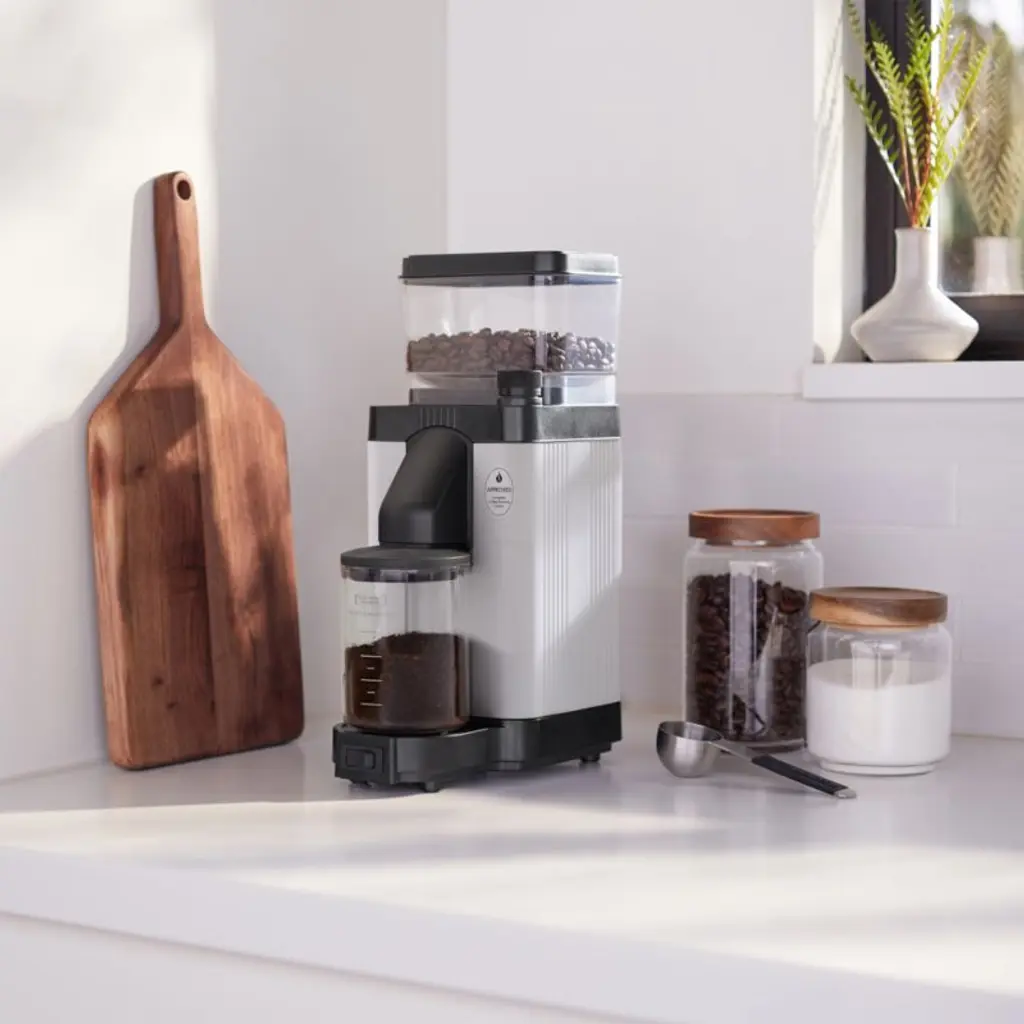 Designed by Moccamaster to meet the company's exacting standards for brewing coffee, this burr grinder guarantees the quality and uniformity of the grind for perfectly extracted coffee. Flat steel burrs deliver a highly precise and uniform grind, and the stepless knob allows for the finest adjustments to create exactly the right size grind for specific brewing methods from medium-fine drip to cold brew. The static-reducing spout delivers mess-free grounds into a glass container with an optional storage lid to keep left-over grounds fresh. The matte white burr grinder complements the sleek styling of the Moccamaster coffee maker (sold separately) and is certified by the European Coffee Brewing Centre to produce grounds that can be brewed to the Golden Cup Standard.