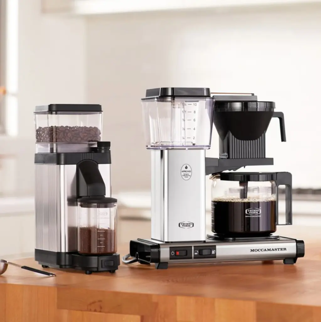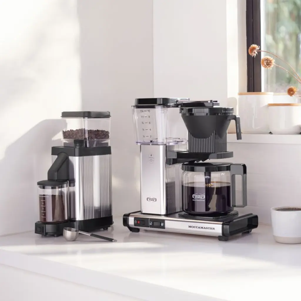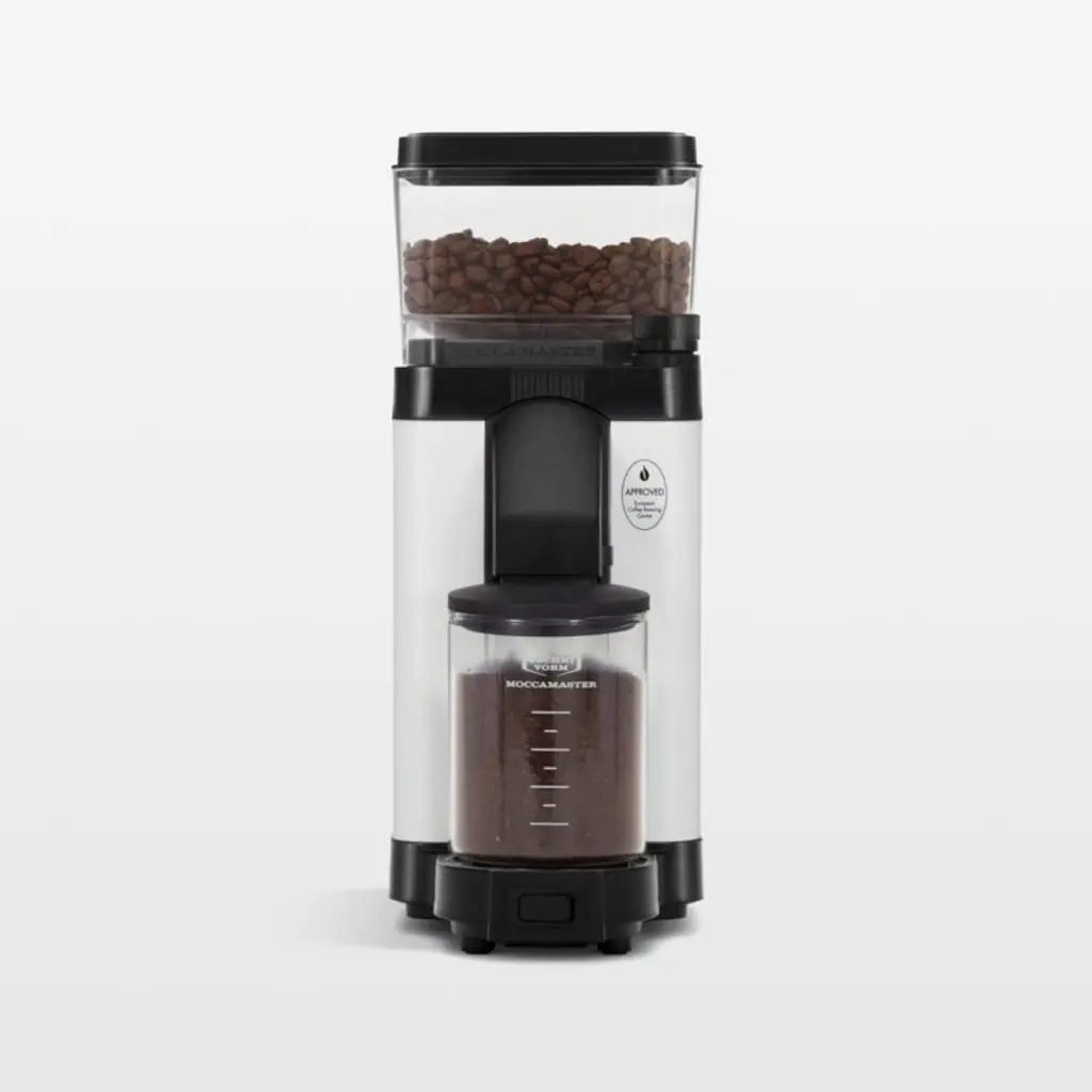 Designed by Moccamaster to meet the company's exacting standards for brewing coffee, this burr grinder guarantees the quality and uniformity of the grind for perfectly extracted coffee. Flat steel burrs deliver a highly precise and uniform grind, and the stepless knob allows for the finest adjustments to create exactly the right size grind for specific brewing methods from medium-fine drip to cold brew. The static-reducing spout delivers mess-free grounds into a glass container with an optional storage lid to keep leftover grounds fresh. The polished silver burr grinder complements the sleek styling of the Moccamaster coffee maker (sold separately) and is certified by the European Coffee Brewing Centre to produce grounds that can be brewed to the Golden Cup Standard.