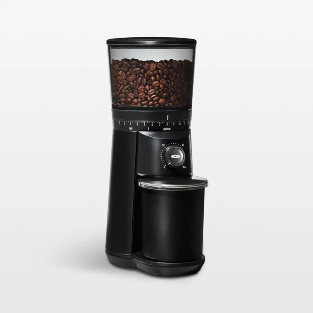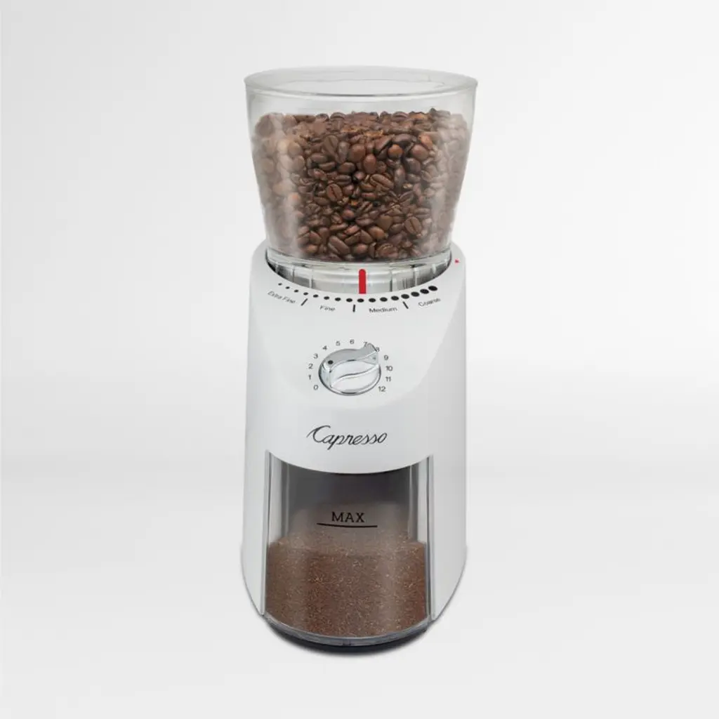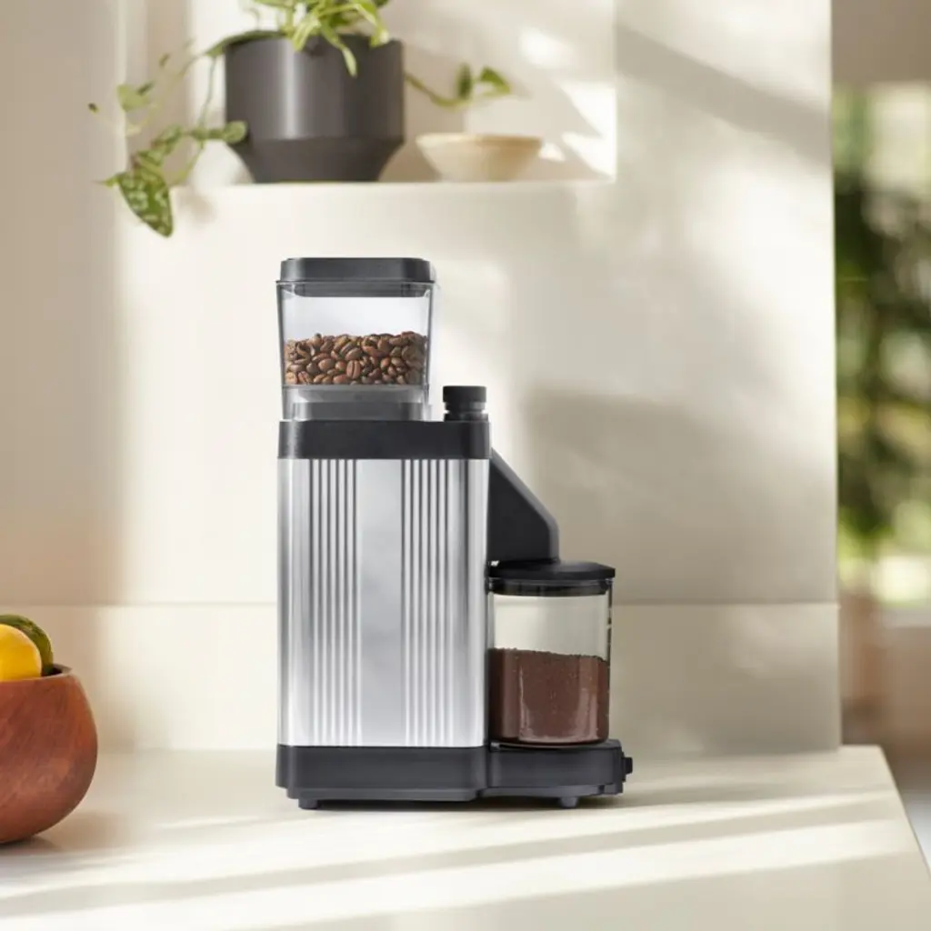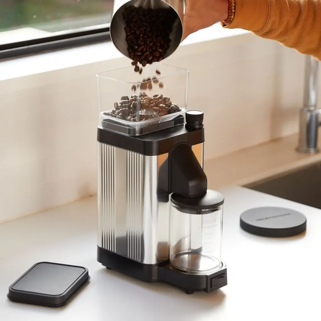 Designed by Moccamaster to meet the company's exacting standards for brewing coffee, this burr grinder guarantees the quality and uniformity of the grind for perfectly extracted coffee. Flat steel burrs deliver a highly precise and uniform grind, and the stepless knob allows for the finest adjustments to create exactly the right size grind for specific brewing methods from medium-fine drip to cold brew. The static-reducing spout delivers mess-free grounds into a glass container with an optional storage lid to keep leftover grounds fresh. The polished silver burr grinder complements the sleek styling of the Moccamaster coffee maker (sold separately) and is certified by the European Coffee Brewing Centre to produce grounds that can be brewed to the Golden Cup Standard.