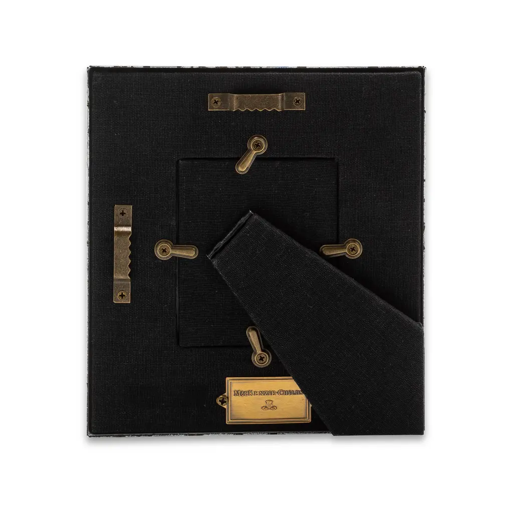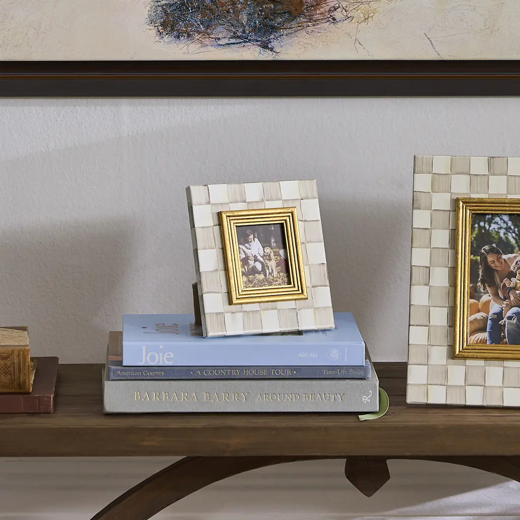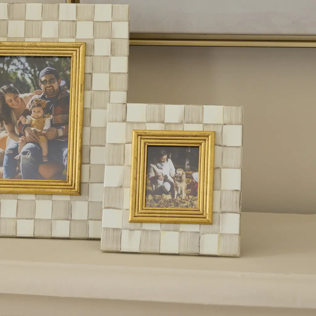 The picture-perfect Mocha Check 2.5" x 3" Frame features hand-painted Mocha Checks on a steel underbody and is backed with linen with a brass logo plate. Its elegant design makes it a stunning way to display your favorite photos or cherished memories, adding a touch of warmth and charm to any room.