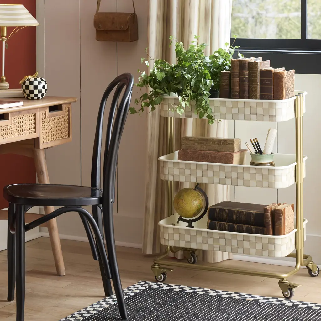 From extra storage to easy-rolling bar cart, there are so many ways to use the Mocha Check Kitchen Cart. Its brass-finished steel frame easily rolls on casters, with three affixed hand-painted Courtly Check enamel trays. Offering plenty of storage room, this versatile piece is always at your service. Pair with Rosy or Sterling Check, or go Mocha all the way!