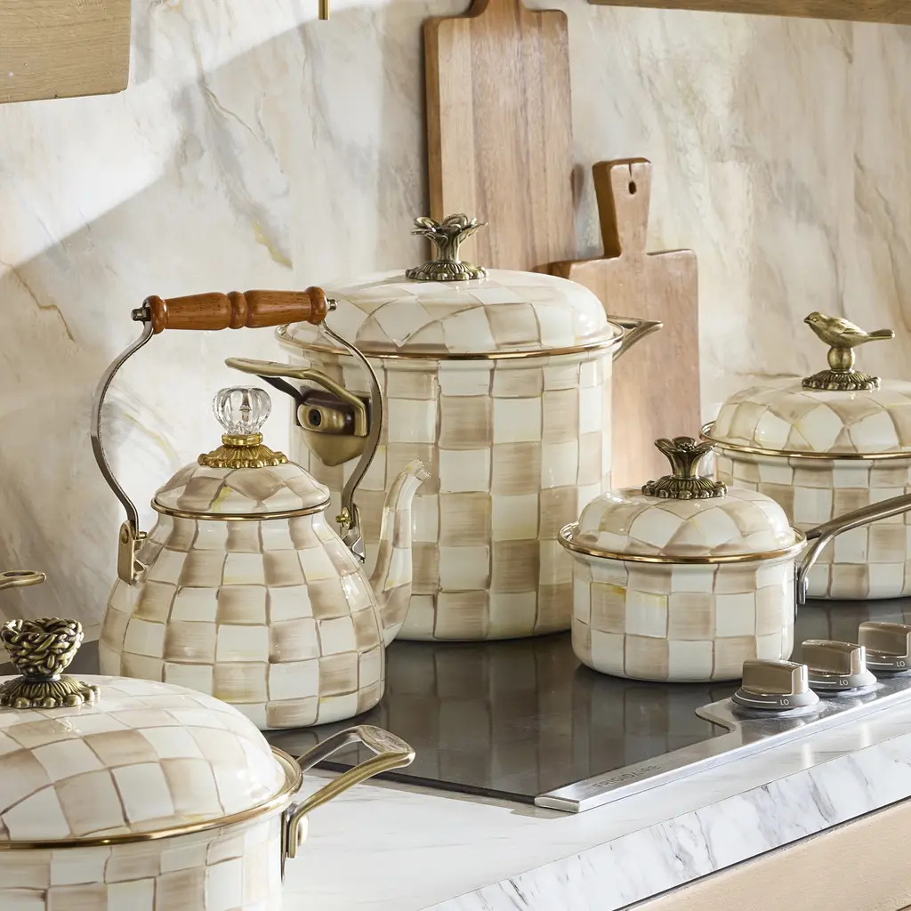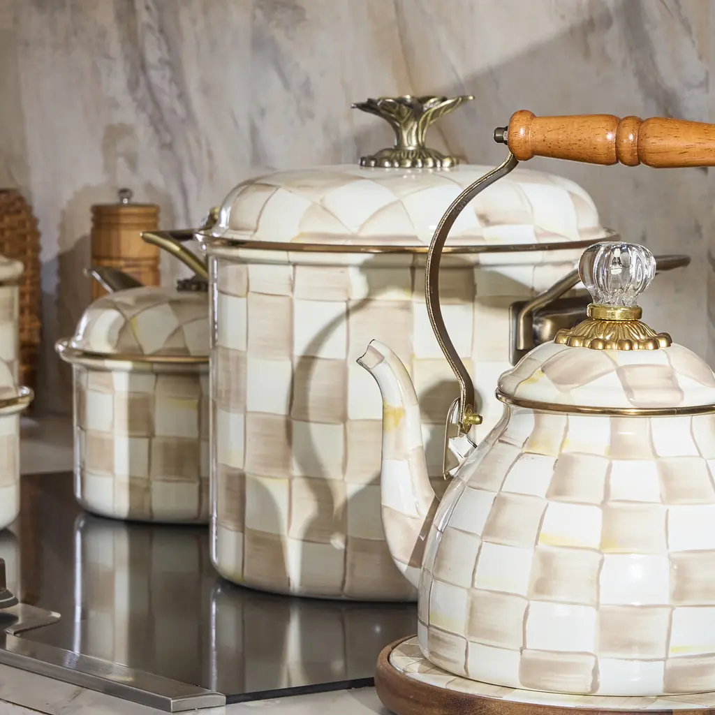 From stovetop to tabletop, our Mocha Check 7 Qt. Stockpot transitions with more than a dash of panache. Imagine how your signature soups and stews will stand out when served up in a dish bedecked with our espresso-inspired check pattern. And to top it all off, a blossoming bud sprouts up to serve as a knob, as unique as it is useful.