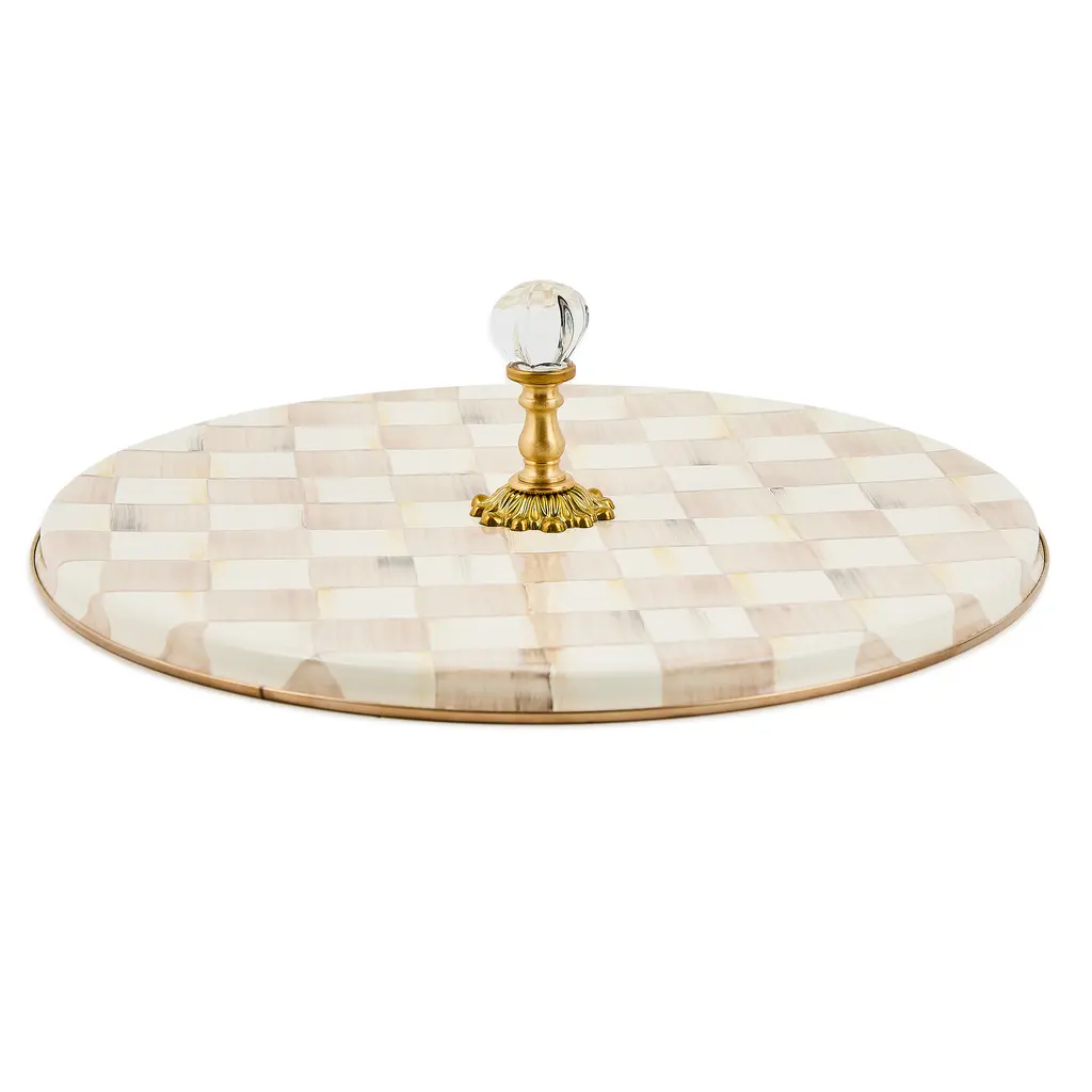 Whether you're creating a charcuterie or presenting pastries, the Mocha Check Cheese Course serves with style. It features our hand-painted checks on a heavy-gauge, hand-glazed steel underbody, topped with a clear glass knob for easy handling. Perfect for adding a touch of elegance and pattern to your next gathering, it elevates both casual and formal entertaining with ease.