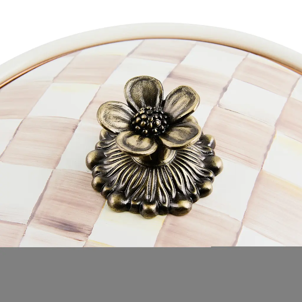Take the Mocha Check Medium Casserbole right from the oven to the table. The heavy-gauge steel underbody is glazed with hand-painted, color-dragged coffee-hued checks. And to top it all off, a charming blossom sprouts up to serve as a knob, as unique as it is useful.