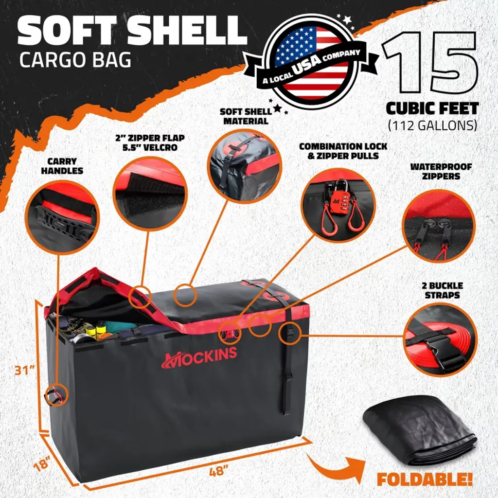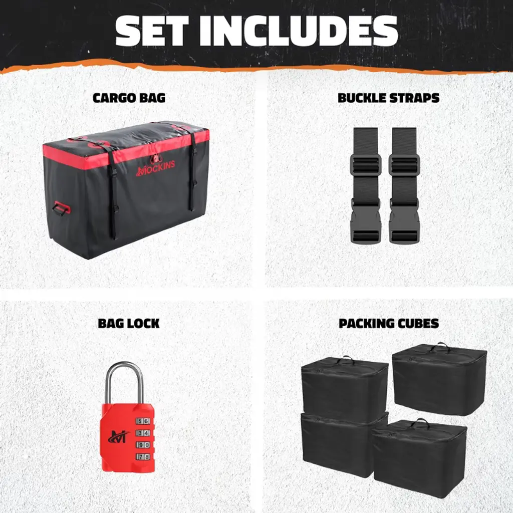 Take on your next adventure with style and confidence with the Mockins Waterproof Cargo Carrier Bag set. Made from abrasion-resistant vinyl with welded seams, and featuring a waterproof zipper enclosed by a 2” flap with Velcro strips, this 15 cubic foot cargo bag will keep all your belongings clean and dry. Along with the bag, you also get 4 stackable packing cubes for conveniently organizing your things, as well as storing the carrier bag when not in use. Plus, we’ve included a combination bag lock and 2 buckle straps to provide extra protection and security while you’re on the road. Optimize the way you pack with Mockins!
