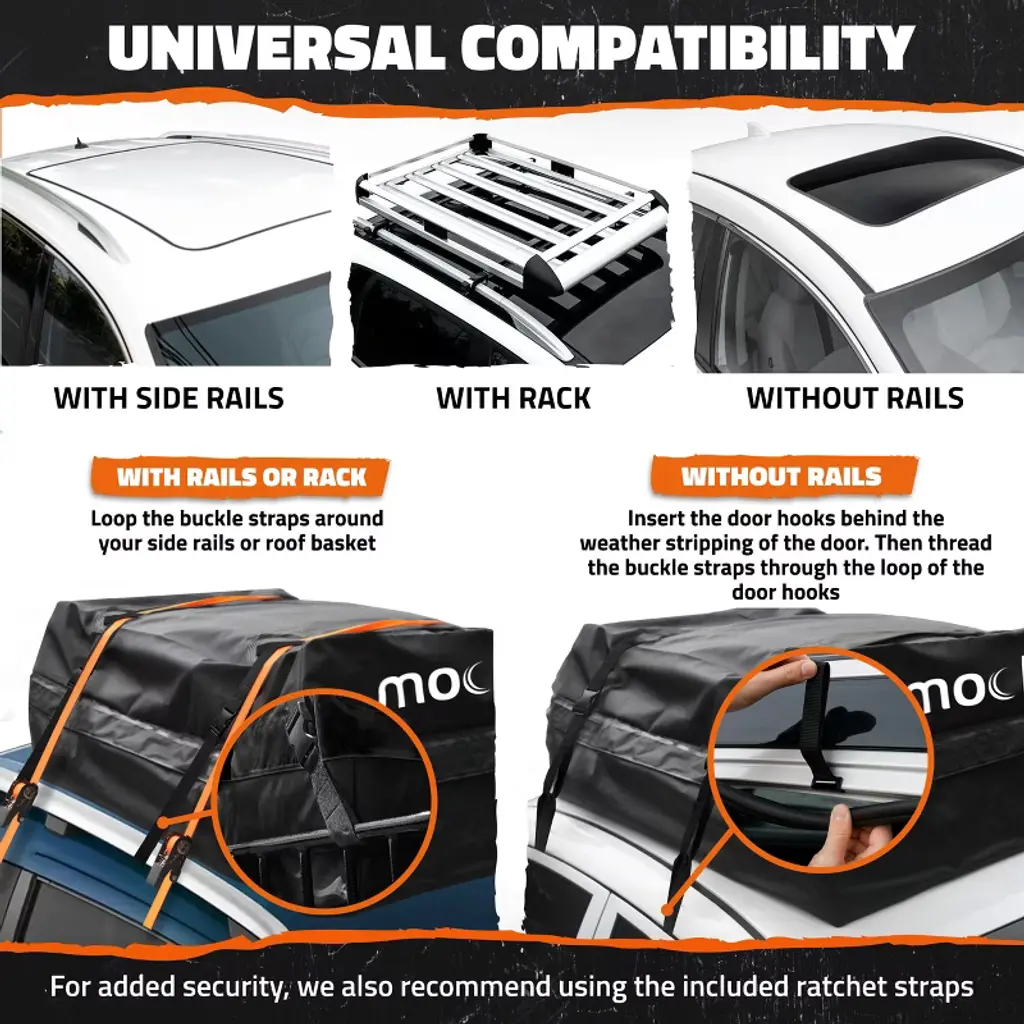 The Mockins Waterproof Roof Cargo Bag increases your car's storage capacity, while also offering superior all-weather protection. This robust and durable roof top bag, constructed from abrasion-resistant vinyl, works with or without a roof rack and was built to last. A waterproof zipper shielded by a Velcro flap assures your belongings stay dry and clean as you travel. The set also comes with straps, hooks, a roof padding mat and a combination lock for comprehensive adaptability and security. Plus, we’ve included a storage bag for safekeeping when not in use. Elevate your car roof storage with Mockins!