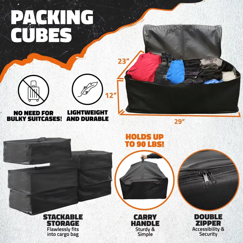 Take on your next adventure with style and confidence with the Mockins Waterproof Cargo Carrier Bag set. Made from abrasion-resistant vinyl with welded seams, and featuring a waterproof zipper enclosed by a 2” flap with Velcro strips, this 30 cubic foot cargo bag will keep all your belongings clean and dry. Along with the bag, you also get 6 stackable packing cubes for conveniently organizing your things, as well as storing the carrier bag when not in use. Plus, we’ve included a combination bag lock and 3 buckle straps to provide extra protection and security while you are on the road. Optimize the way you pack with Mockins!