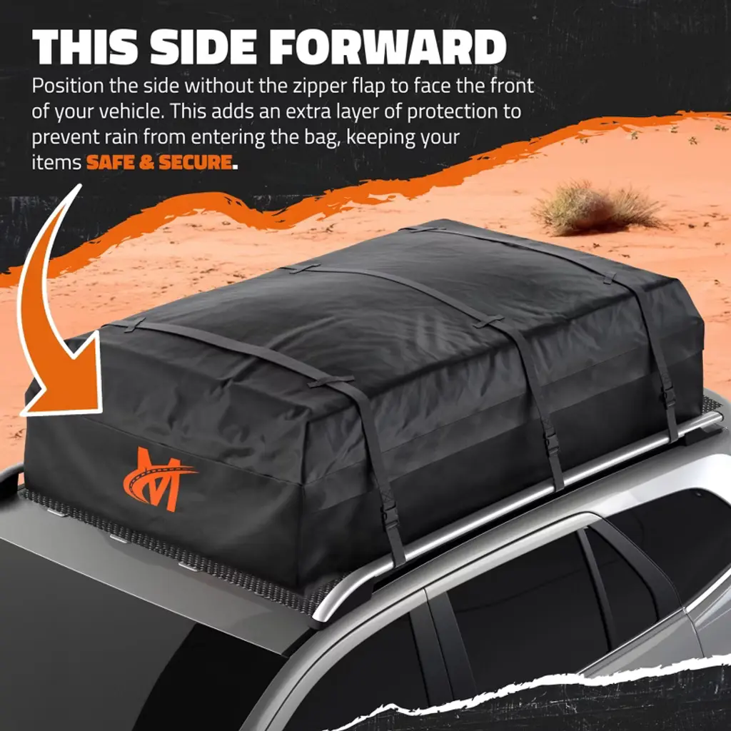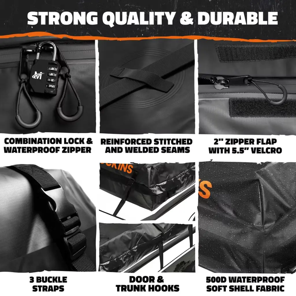 The Mockins 40 Cubic Foot Roof Cargo Bag is your secure and a hassle-free hauling solution, instantly increasing your storage capacity without hindering passenger comfort. Crafted from 100% waterproof vinyl, this carrier bag is constructed with welded seams that ensure your belongings stay dry and safe in any weather. The rooftop cargo bag set includes ratchet and buckle straps to secure cargo, as well as a bag lock to deter theft. Connecting this roof carrier bag to your vehicle is simple thanks to the 6 door hooks, and 2 trunk hooks for use on vehicles without rear window access. This soft-shell roof bag is a practical and dependable way to transport your cargo and can easily be folded and stored in the provided carry bag.