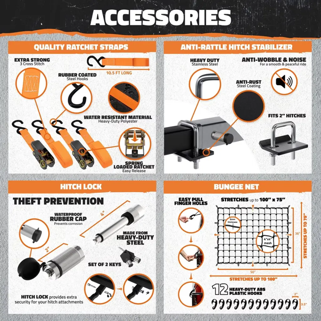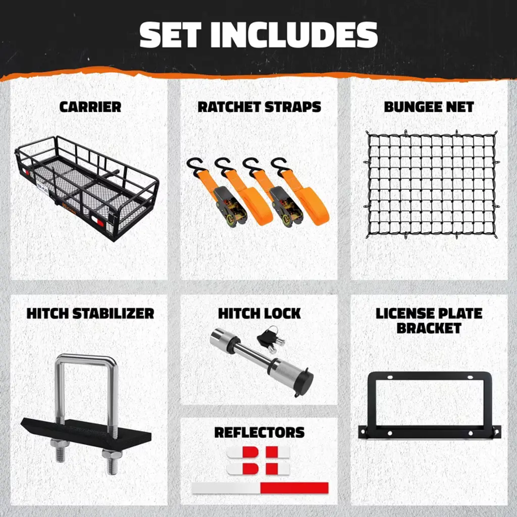 The Mockins High Rail Hitch Cargo Carrier is expertly designed to transport large and irregular cargo without the stress. Providing a substantial 500 lbs. capacity with 14” high side rails, this hitch cargo rack handles everything from sporting equipment and camping gear to luggage and construction materials. The package also includes a 50"L x 36"W bungee cargo net (expandable to 100"L x 75"W) and adjustable ratchet straps, as well as a hitch stabilizer and lock, to keep your belongings secure. For those in need of a reliable, heavy-duty car rack, the Mockins High Rail Tow Hitch Cargo Carrier Rack is the way to go!