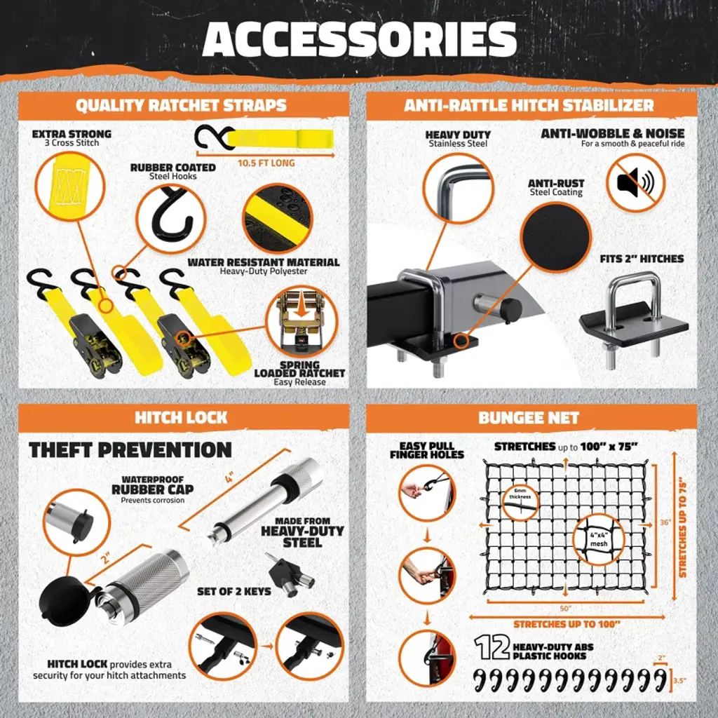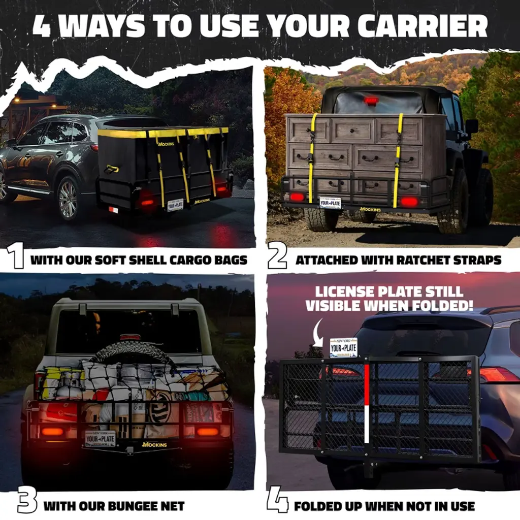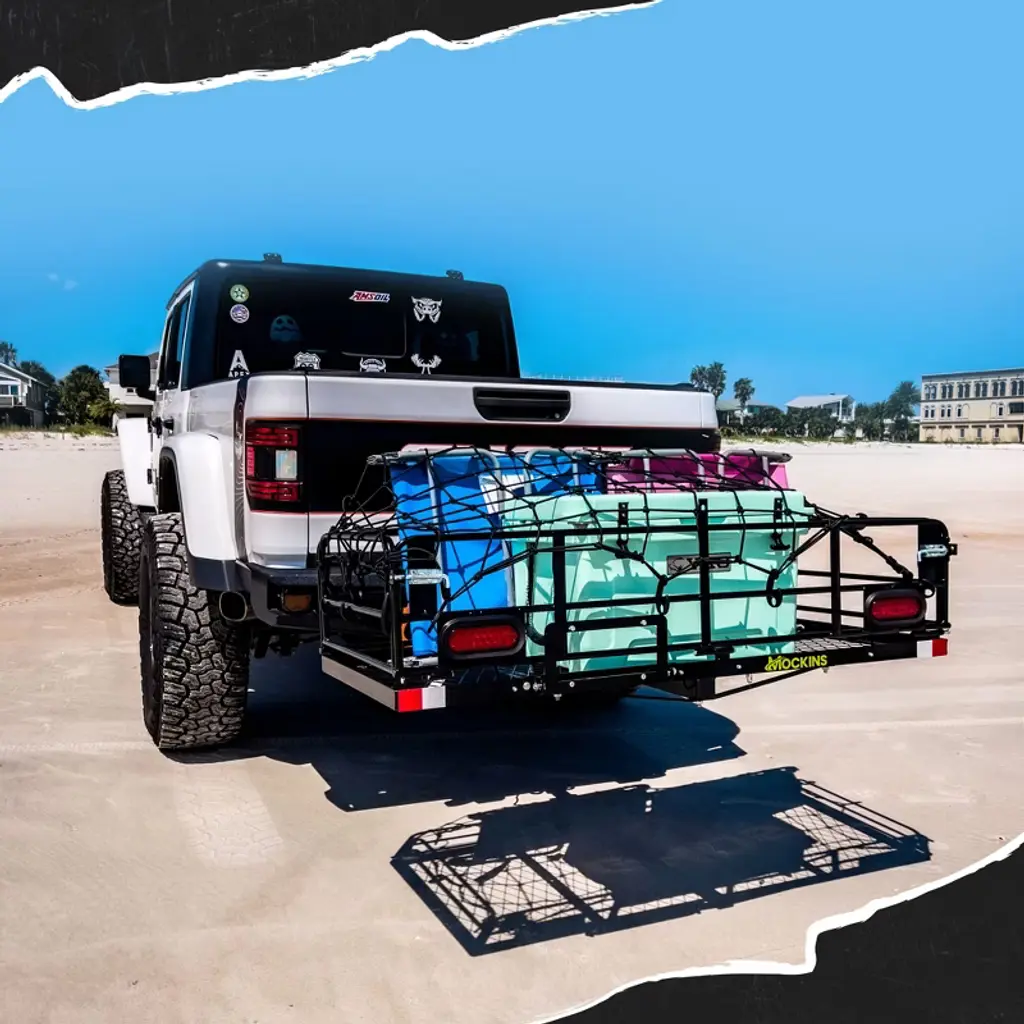 The Mockins High Rail Hitch Cargo Carrier bundle is expertly designed to transport large and irregular payloads without the hassle. Providing a substantial 500 lbs. capacity with 14” high side rails, this hitch cargo rack handles everything from sporting equipment and luggage to camping gear and construction materials. The built-in rear lights provide peace of mind in instances where your cargo obstructs the rear of your vehicle, or when driving at night. The package also includes a 60" x 24" x 36" (30 Cu.Ft.) weatherproof vinyl hitch cargo bag to protect your belongings, as well as straps and a luggage lock to keep everything secure. For those in need of a dependable, heavy-duty car rack, the Mockins High Rail Trailer Hitch Cargo Rack is the answer!