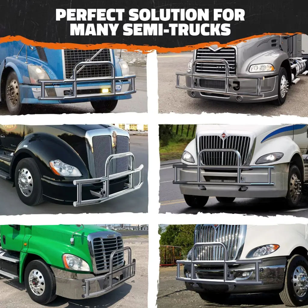 Fortify your truck tractor with the Mockins Grille Guard, constructed for superior heavy-duty protection. Specially forged for semi-truck coverage, this truck bumper guard defends against the unexpected, keeping you safe and the front of your rig intact. Don’t settle on your semi’s security with the Mockins Heavy Duty Truck Grille Guards.