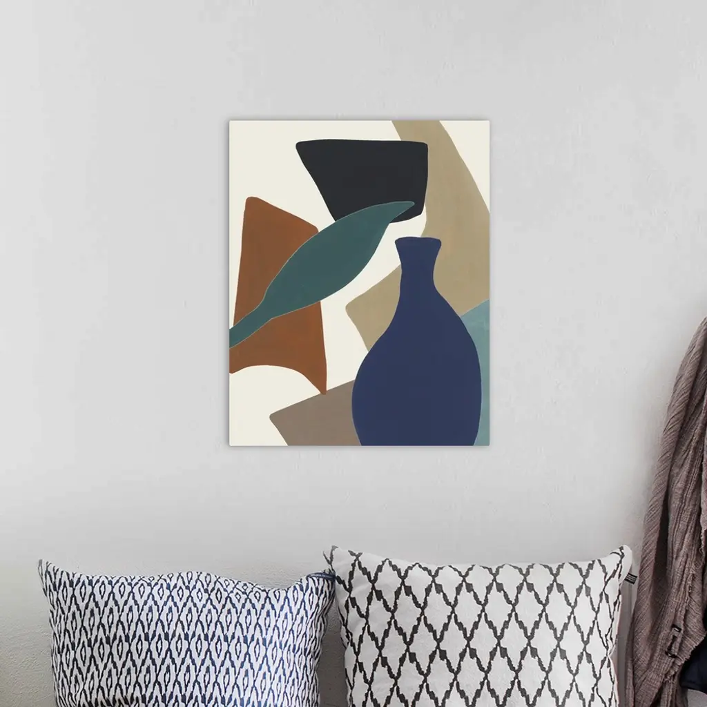 Contemporary abstract collage of flowers, leaves, shapes, and vases in earth tones and blue.