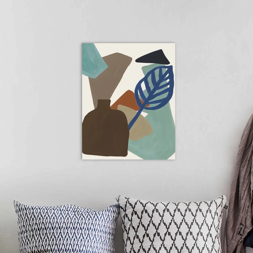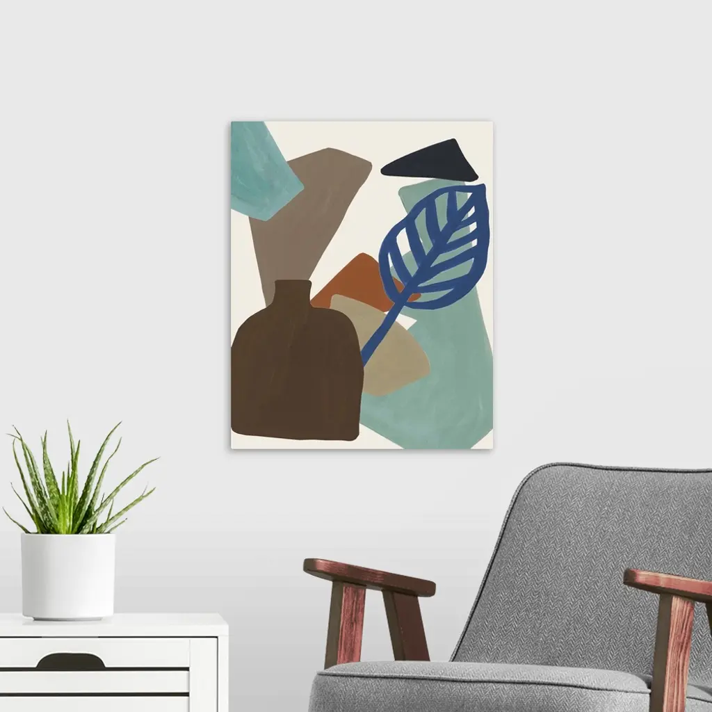 Contemporary abstract collage of flowers, leaves, shapes, and vases in earth tones and blue.