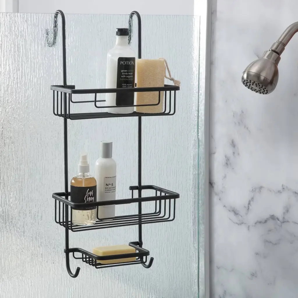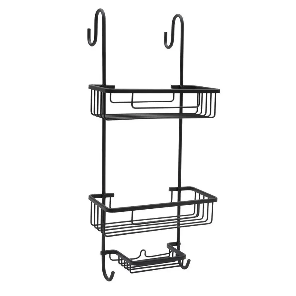 Introducing our black Aluma over-the-door caddy, crafted from durable aluminum for long lasting reliability. Effortlessly install this caddy on any standard door, instantly adding convenient storage to your bathroom. With three spacious shelves, it offers ample room for organizing your essentials. Resistant to rust and water, this caddy ensures a sleek and functional solution to keep your bathroom clutter free.