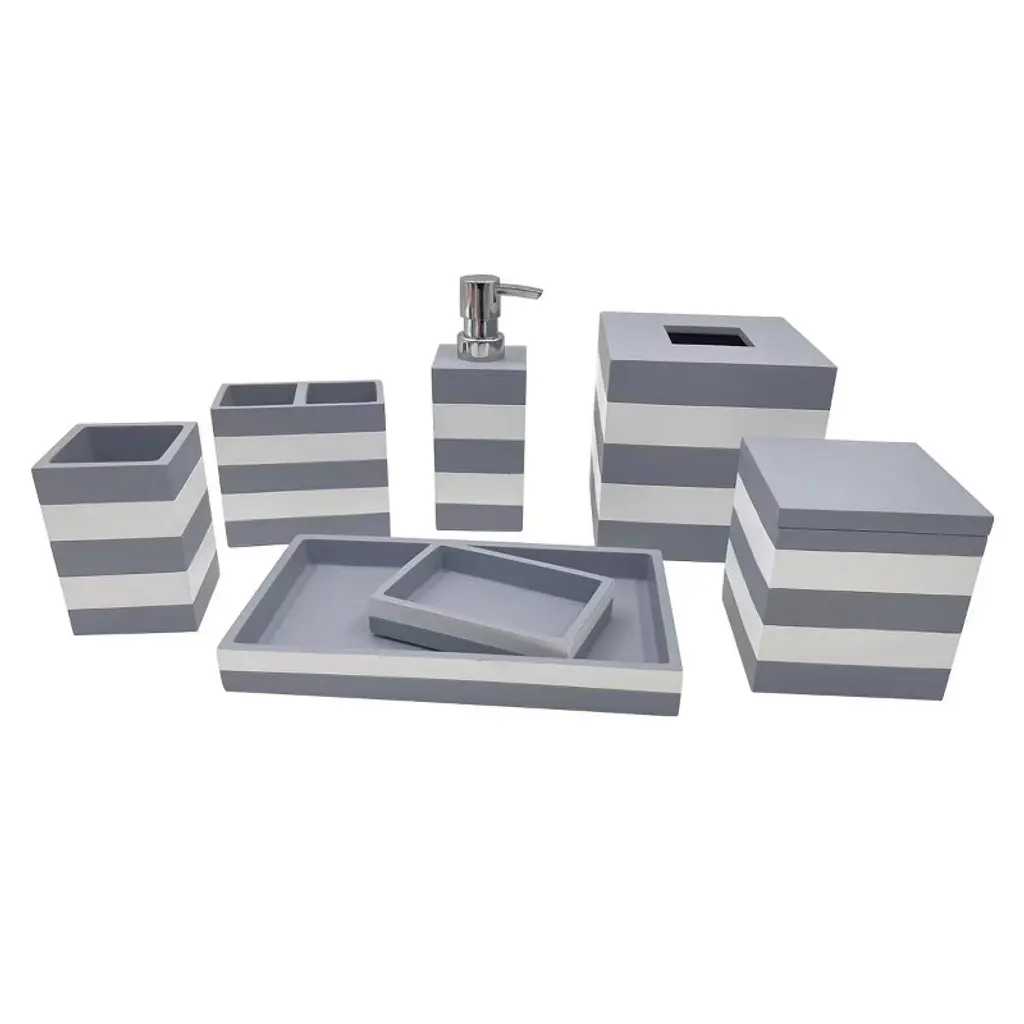 The Elle Caban soap/lotion dispenser adds a fresh, coastal vibe to your bathroom. Made from durable resin, it features clean white and grey stripes that evoke a breezy, nautical charm. Its smooth pump delivers effortless dispensing, while the stylish design enhances any countertop. Both practical and decorative, Elle Caban brings casual elegance to your daily routine.