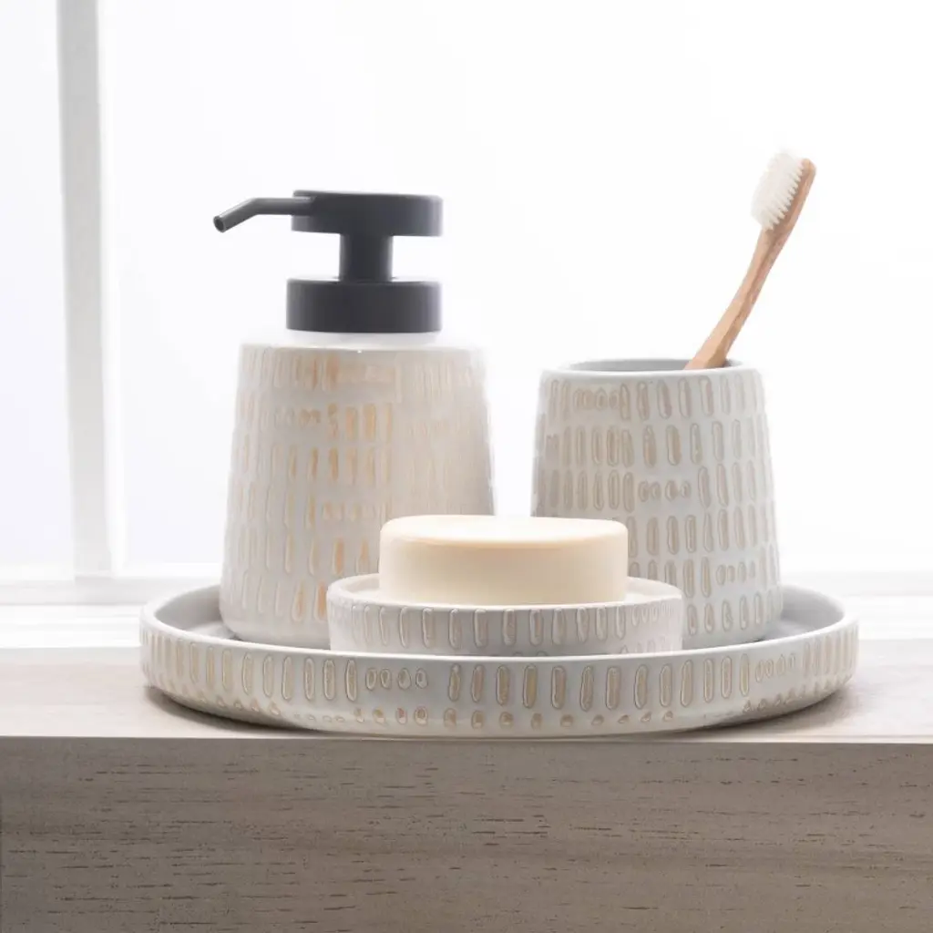 Introducing Tunisia, a rustic collection featuring a translucent milky glaze that reveals warm natural clay undertones, creating a soft interplay of visual textures. Seamlessly blending modern and primitive aesthetics, Tunisia offers a captivating addition to your bathroom decor. In its emphasis on a rich, tactile experience, Tunisia embraces a primitive pattern. This captivating line includes four essential pieces: a round tray, a soap pump, a tumbler, and a soap dish. Meticulously designed, each item seamlessly blends functionality and aesthetics, ensuring a sophisticated addition to your bathroom decor.